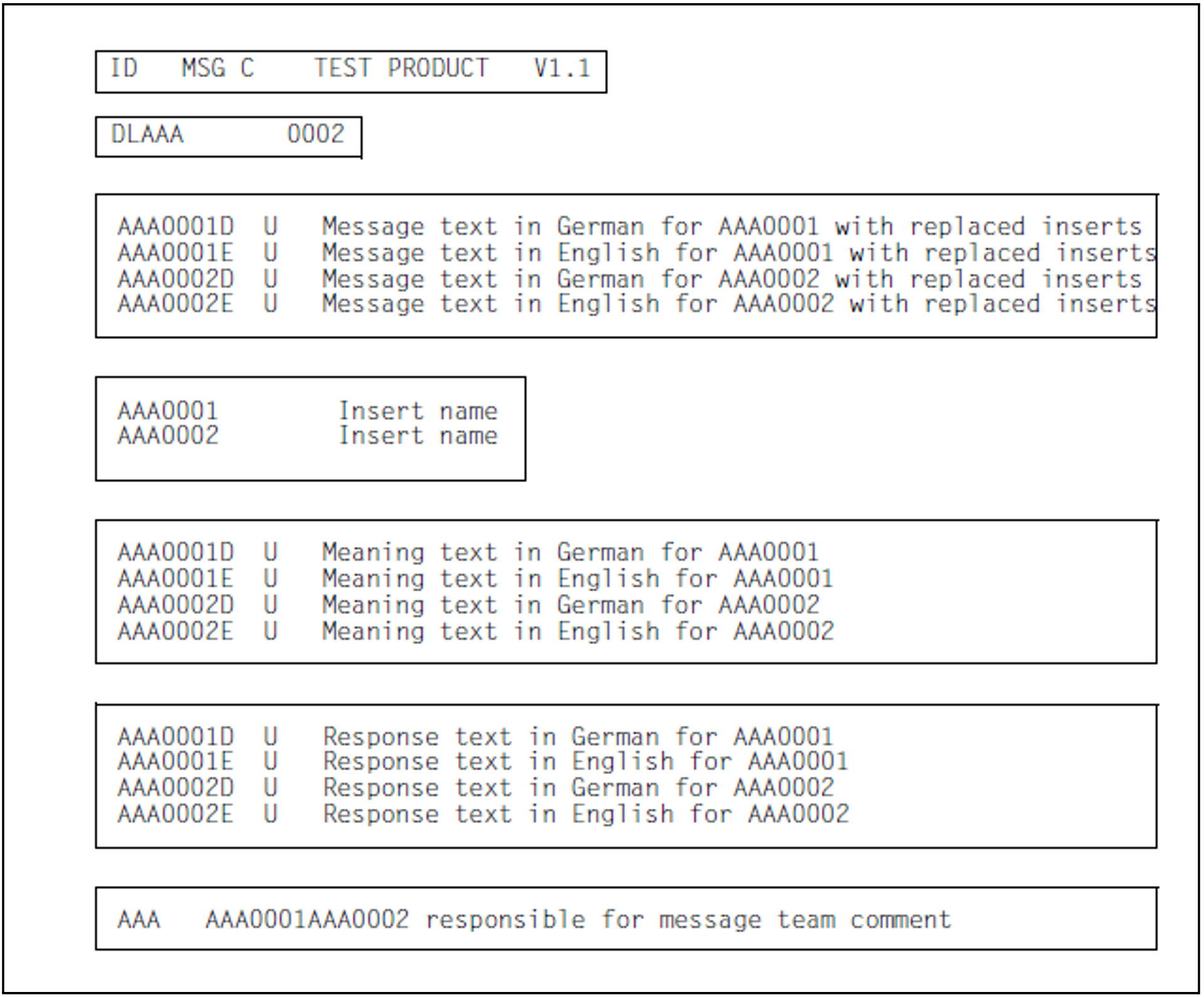 Each message file created using the MSGMAKER utility routine consists of a number of message units, each of which is accessed via a seven-character message code. The message unit comprises message attributes, message text and, if appropriate, a meaning and response text that explains in more detail the problem indicated in the message and indicates possible responses. All texts can be entered in up to eight languages. Each language is represented by a single letter, the language identifier.
