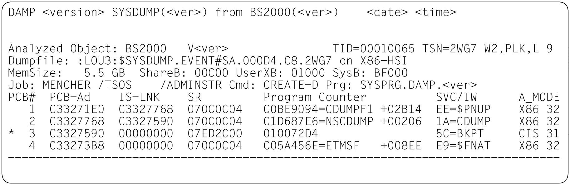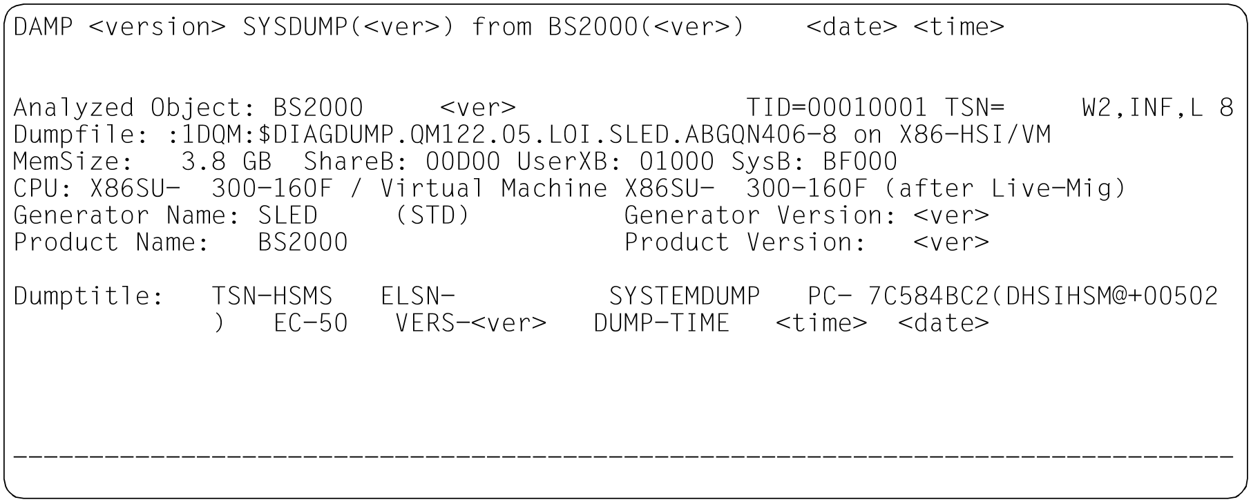 Example windows for the various dump file types in INF mode Figure 11: Information screen in the status window (W2). Dump created by CDUMP. Dump object: BS2000 (SU x86 after Live Migration) |