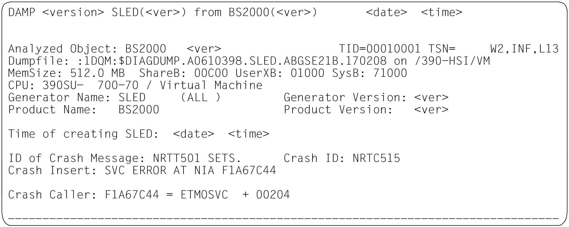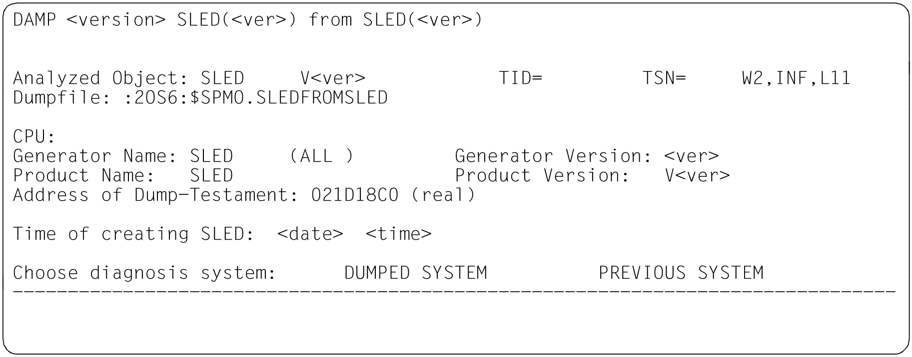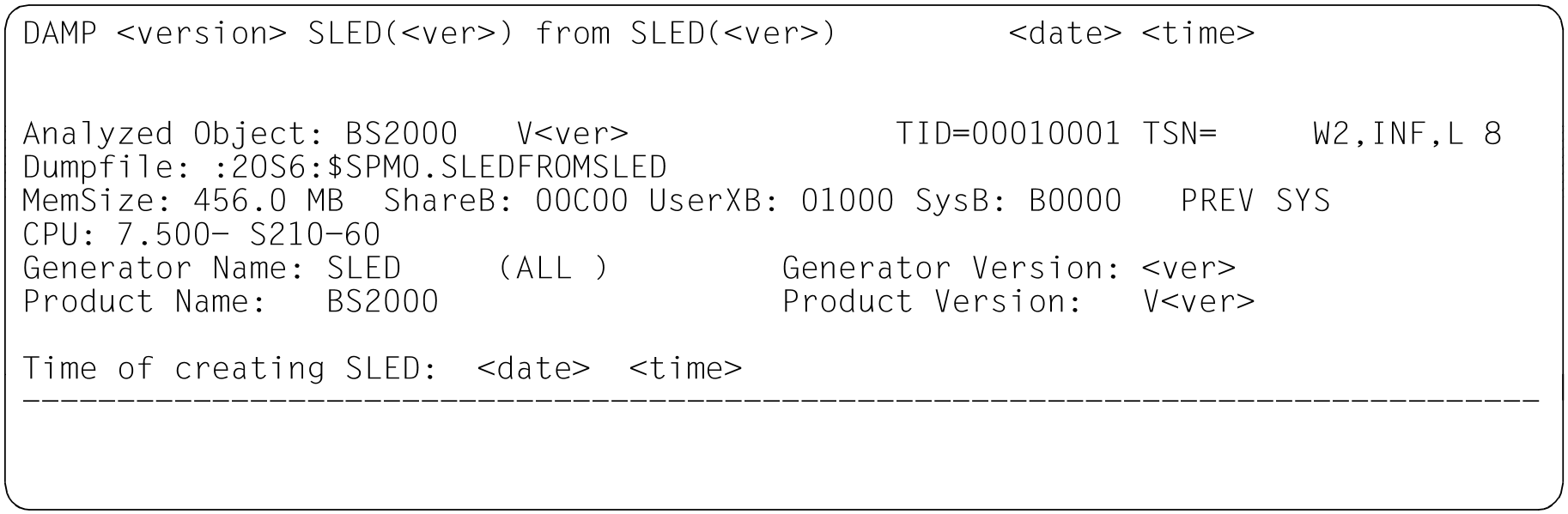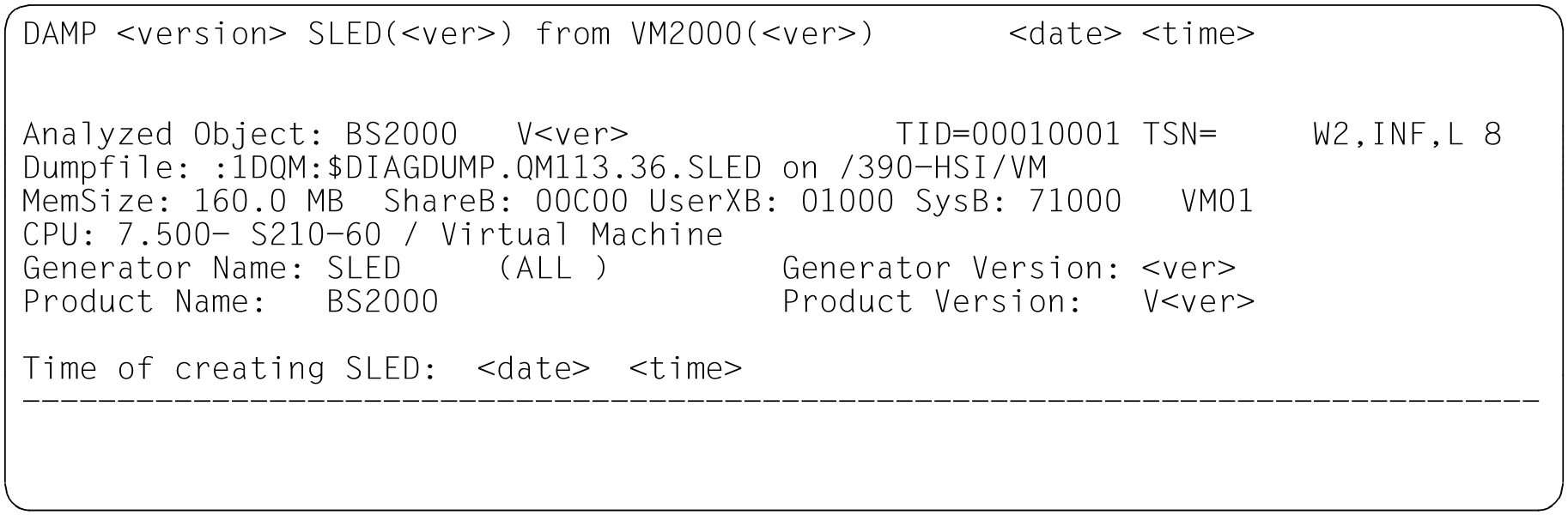 INF | Figure 12: Information screen in the status window (W2). Dump created by SNAP. Dump object: BS2000 (SU /390 after abnormal system termination) Figure 13: Information screen in the status window (W2). Dump created by SLED. Dump object: BS2000 (S server) Figure 14: Information screen in the status window (W2). Dump created by SLED; dump object: VM2000 Figure 15: Information screen in the status window (W2). Dump created by SLED; dump object: SLED Figure 16: Information screen in the status window (W2). Dump created by SLED; dump object: BS2000 in the monitor VM |
