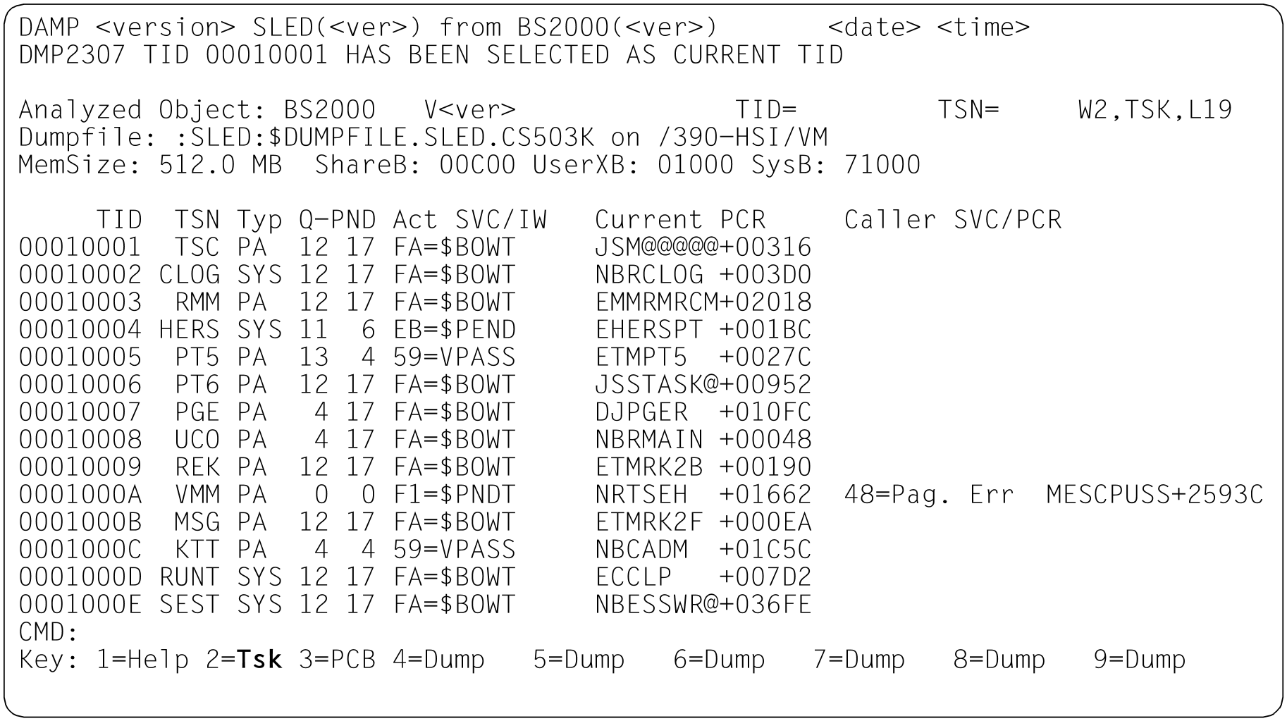 | TSK | This mode is set automatically if a SLED or SNAP with a BS2000 object or the currently active system is to be analyzed and information relating to a number of tasks is available. Only the first 14 tasks are initially shown in the status window (W2). Each line contains the information for one task and can be marked. When diagnosing the active system, the task list is updated only on positioning with “--” to the beginning of the list (i.e. when TID 0001 is displayed). When diagnosing the active system, the termination or creation of tasks can also result in inconsistencies in other windows. If necessary, these have to be updated by bringing the task list up to date. |