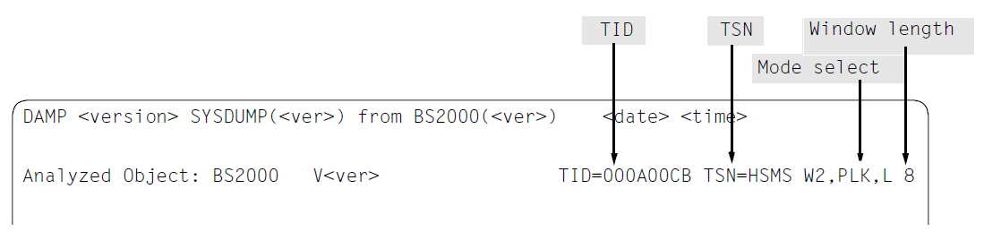 By marking (see section "Marking" (Modifying the diagnostic windows)) the address of the dump testament, the memory contents of the dump testament can be output to a standard window with the RM or ABS addressing mode. Depending on the dump file type, the following information is included: