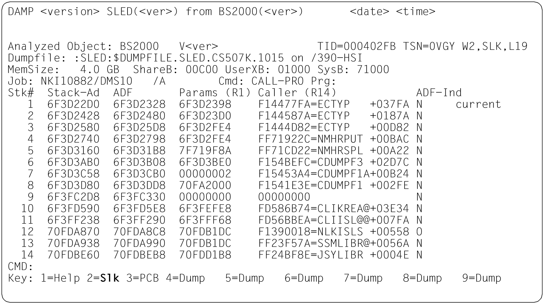 Figure 12: Information screen in the status window (W2). Dump created by SNAP. Dump object: BS2000 (SU /390 after abnormal system termination) Figure 13: Information screen in the status window (W2). Dump created by SLED. Dump object: BS2000 (S server) Figure 14: Information screen in the status window (W2). Dump created by SLED; dump object: VM2000 Figure 15: Information screen in the status window (W2). Dump created by SLED; dump object: SLED Figure 16: Information screen in the status window (W2). Dump created by SLED; dump object: BS2000 in the monitor VM | |
