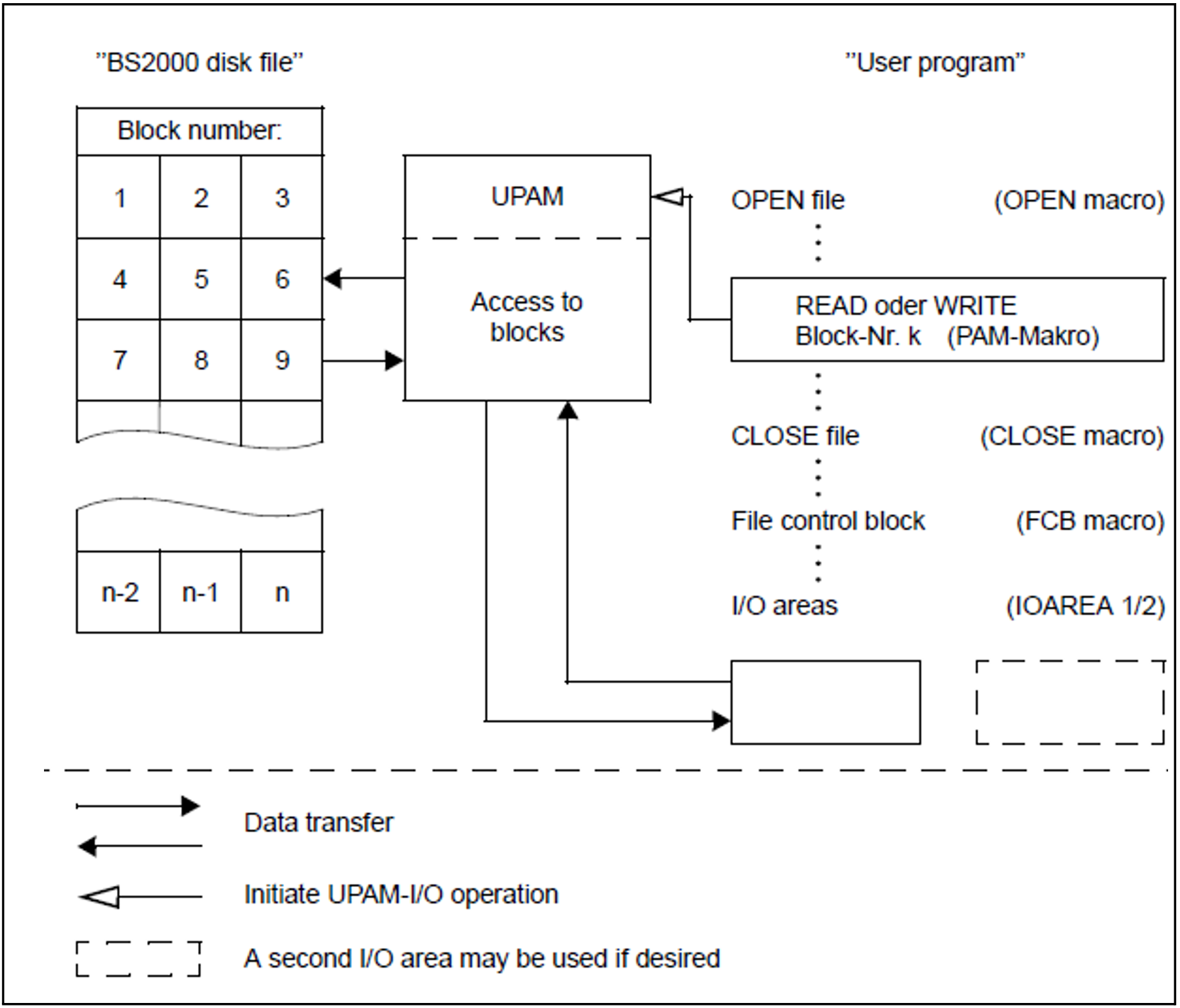UPAM is the primary, block-oriented access method in BS2000 for random access to disk files. Read or write access to any block of a file is possible at any time.