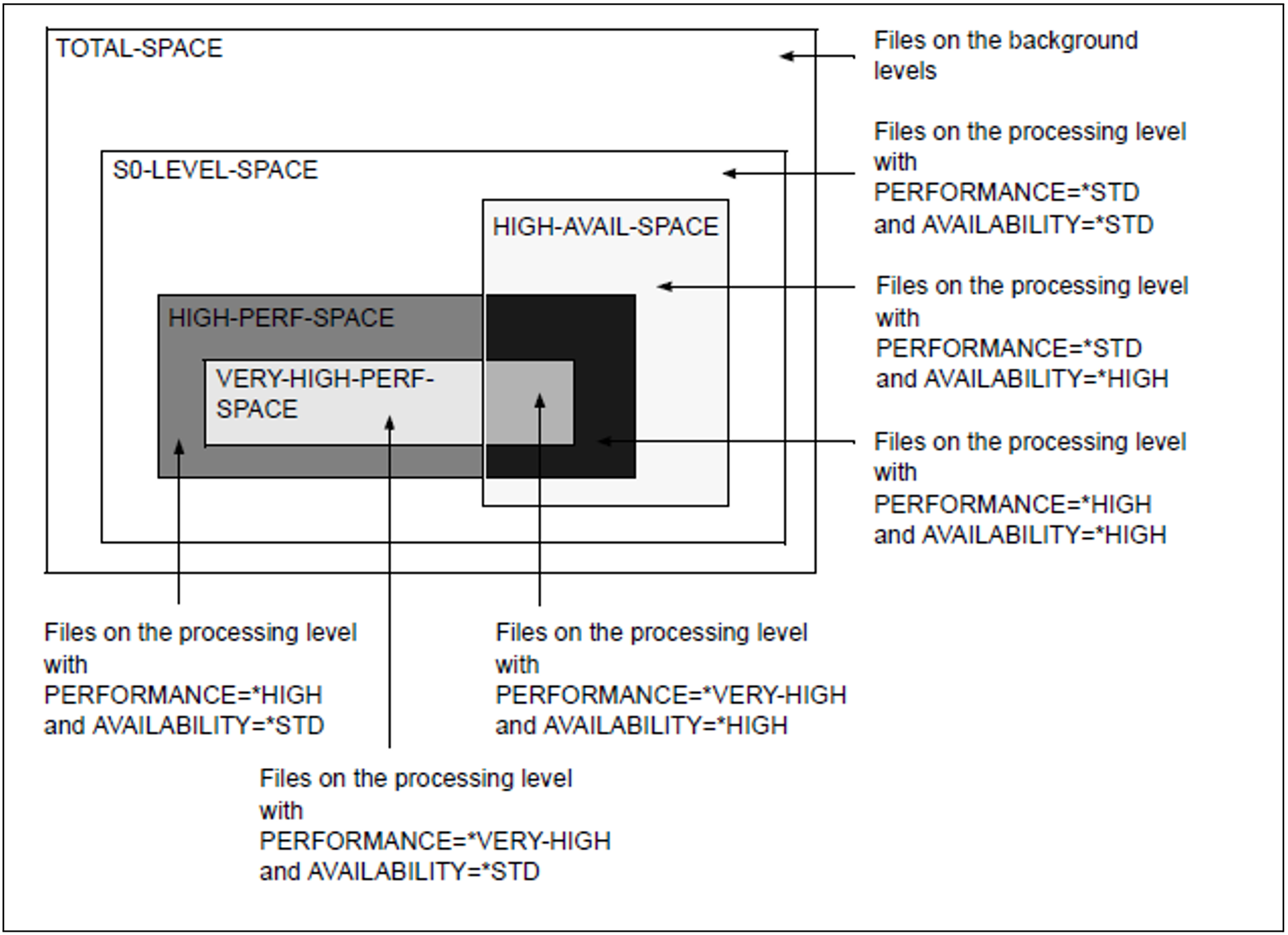 Creating a file with the attributes AVAILABILITY=*HIGH and PERFORMANCE=*HIGH, causes the occupied values for the S0-LEVEL-SPACE and TOTAL-SPACE quotas, in addition to those for HIGH-AVAIL-SPACE and HIGH-PERF-SPACE, to be increased by the number of half-pages assigned to the file.