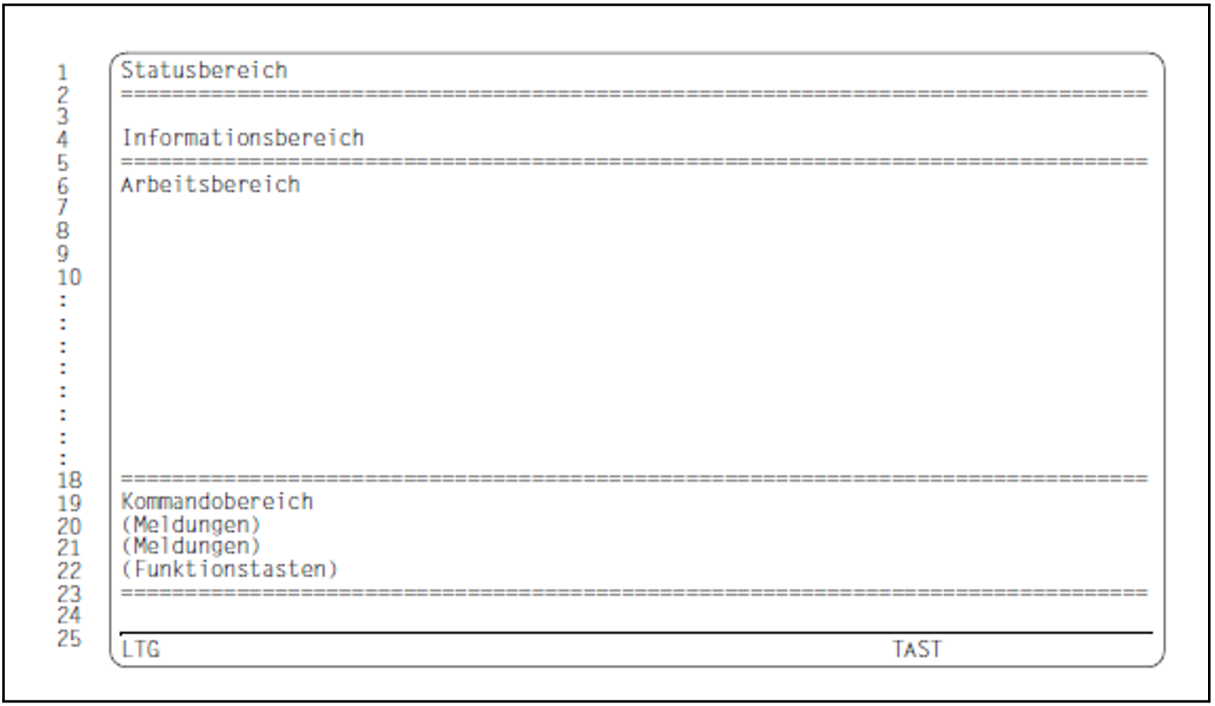 Im dreizeilige Kommandobereich besteht die Möglichkeit eine Anweisung oder die Zeichen „+“ oder „-“ einzugeben. Ferner wird in der letzten Zeile der Maske die Belegung der Funktionstasten angezeigt.