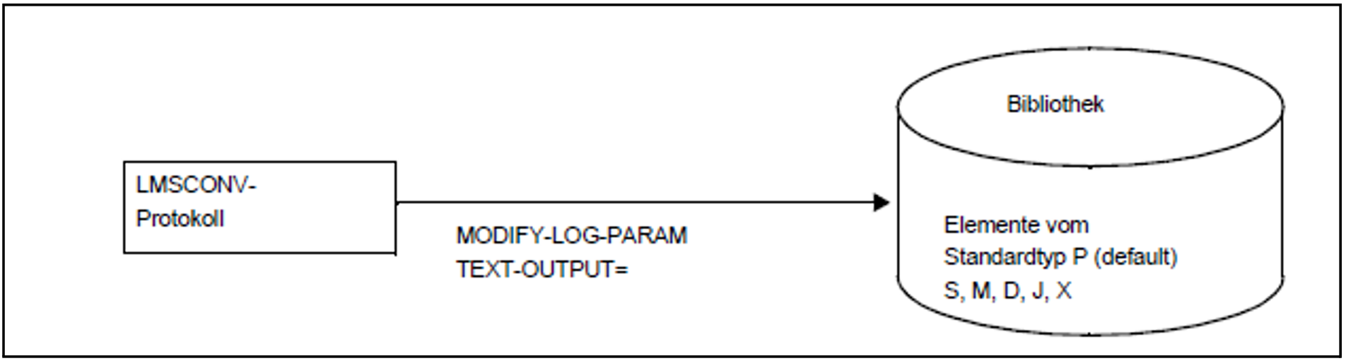 Die Anweisung MODIFY-LOGGING-PARAMETERS TEXT-OUTPUT=*LIBRARY-ELEMENT (siehe "MODIFY-LOGGING-PARAMETERS - Protokolleinstellungen ändern") schreibt das LMSCONV-Protokoll in das durch *LIBRARY-ELEMENT spezifizierte Element: