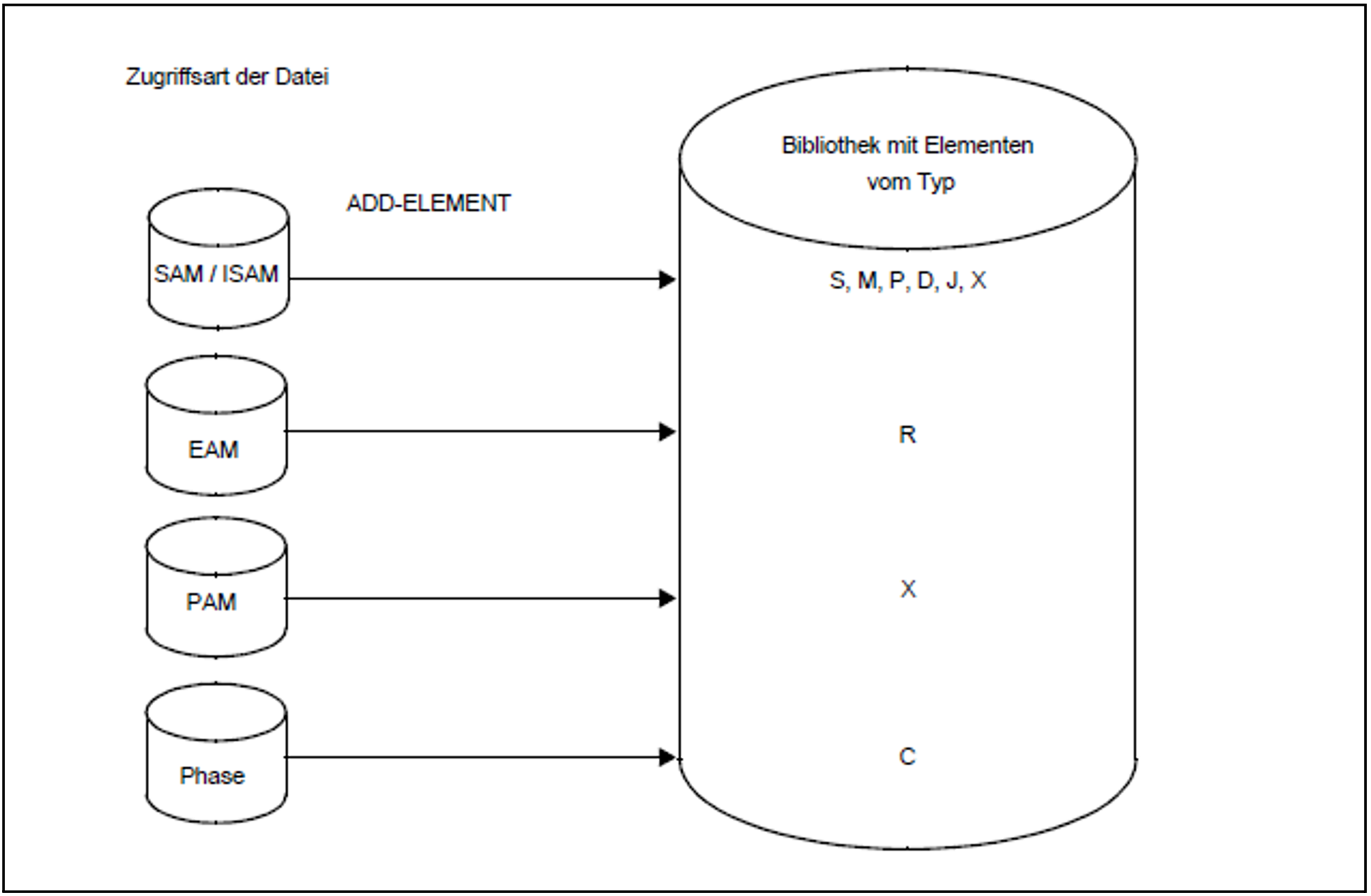 Die Anweisung ADD-ELEMENT (siehe "ADD-ELEMENT - Element in Bibliothek aufnehmen") nimmt Dateien, Module aus dem EAM-Bereich und Datensätze aus dem LMSCONV-Anweisungsstrom als Elemente in die zugewiesene Bibliothek auf. Wird keine Bibliothek angegeben, wird die durch Anweisung OPEN-LIBRARY eröffnete Bibliothek genommen.