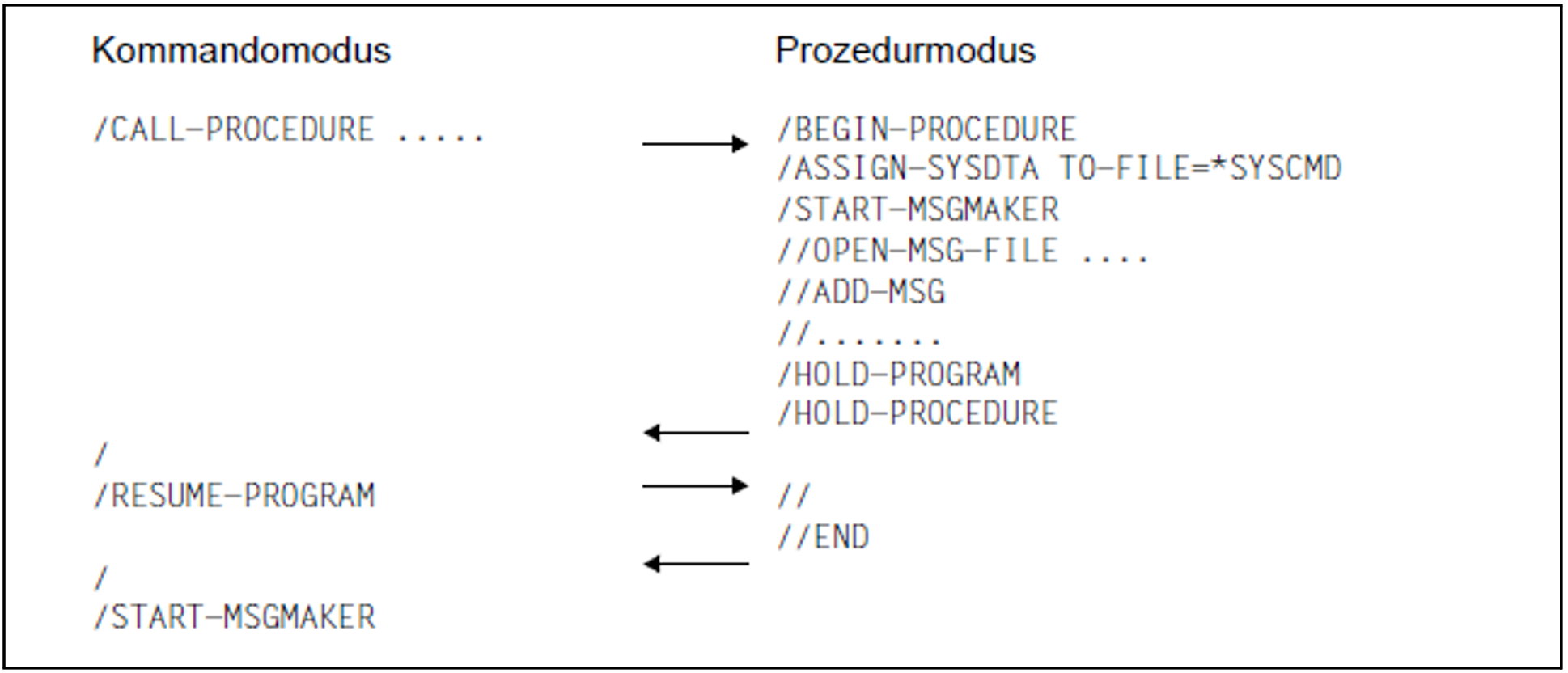 MSGMAKER wird in einer Prozedur aufgerufen. Die MSGMAKER-Anweisungen stehen ebenfalls in dieser Prozedur. MSGMAKER wird also im Prozedurmodus gestartet. Durch /HOLD-PROGRAM bzw. /HOLD-PROCEDURE wird das Programm bzw. die Prozedur unterbrochen. Sie befinden sich nun auf Kommandoebene.