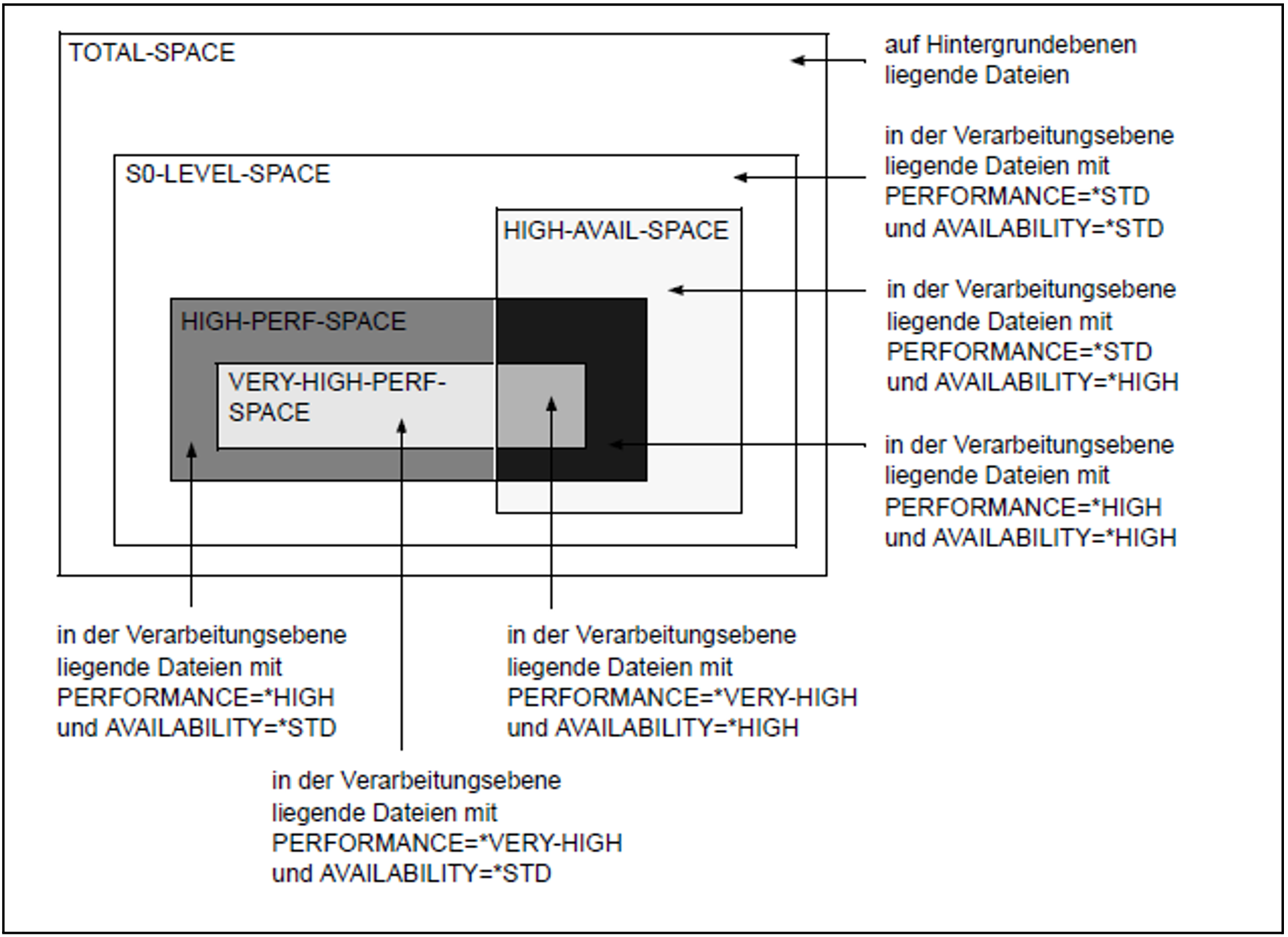 Das Anlegen einer Datei mit den Attributen AVAILABILITY=*HIGH und PERFORMANCE=*HIGH führt dazu, dass neben den Belegt-Werten der Kontingente für HIGH-AVAIL-SPACE und HIGH-PERF-SPACE auch die Belegt-Werte für S0-LEVEL-SPACE und TOTAL-SPACE um die Anzahl von Half-Pages erhöht werden, welche der Datei zugewiesen sind.