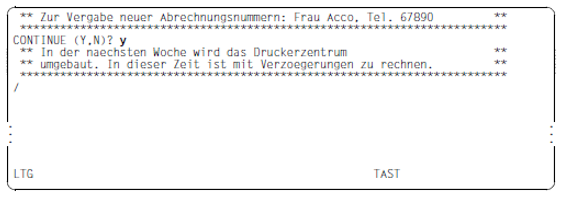 Neben Nachrichten, die an alle Benutzer adressiert sind, können spezielle Informationen an bestimmte Zielgruppen oder einzelne Benutzer gesendet werden. Dem Dialogteilnehmer wird dies durch Ausgabe der folgenden Meldung angeboten:CONTINUE userid (Y,N)?