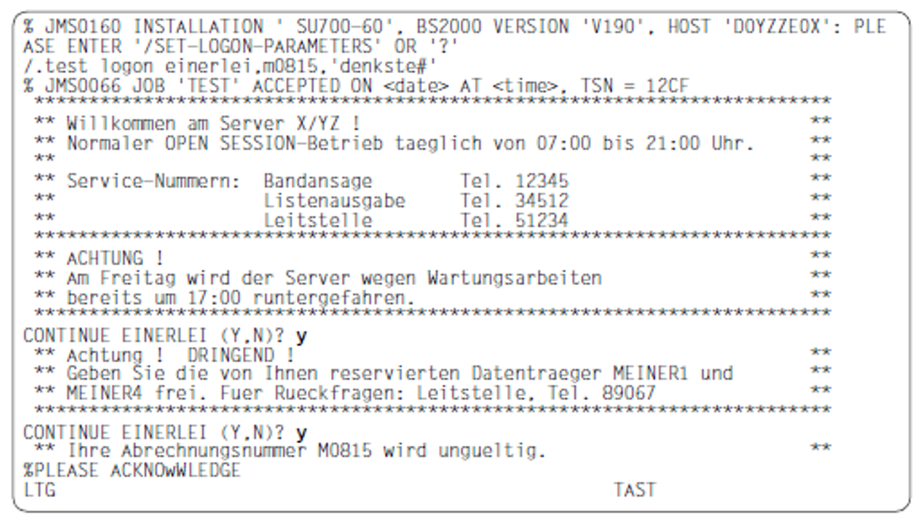 /START-EDT ************************************************************************* ** Willkommen am Server X/YZ ! ** ** Normaler OPEN SESSION-Betrieb taeglich von 07:00 bis 21:00 Uhr. ** ** ** ** Service-Nummern: Bandansage Tel. 12345 ** ** Listenausgabe Tel. 34512 ** ** Leitstelle Tel. 51234 ** ************************************************************************* ** ACHTUNG ! ** ** Am Freitag wird der Server wegen Wartungsarbeiten ** ** bereits um 17:00 runtergefahren. ** ************************************************************************* **STOP**$EINERLEI ** ACHTUNG ! DRINGEND ! ** ** Geben Sie die von Ihnen reservierten Datentraeger MEINER1 und ** ** MEINER4 frei. Fuer Rueckfragen: Leitstelle, Tel. 89067 ** ************************************************************************* **STOP**$ALLERLEI ** ACHTUNG ! ** ** Ihre Privatplatte PRIV03 steht momentan nicht zur Verfuegung. ** ** Bitte setzen Sie sich mit uns in Verbindung (Tel. 51234). ** ************************************************************************* **STOP**$EINERLEI ** Ihre Abrechnungsnummer M0815 wird ungueltig. ** ** Zur Vergabe neuer Abrechnungsnummern: Frau Acco, Tel. 67890 ** ************************************************************************* **STOP** ** In der naechsten Woche wird das Druckerzentrum ** ** umgebaut. In dieser Zeit ist mit Verzoegerungen zu rechnen. ** ************************************************************************* W'BULLETIN' HALT