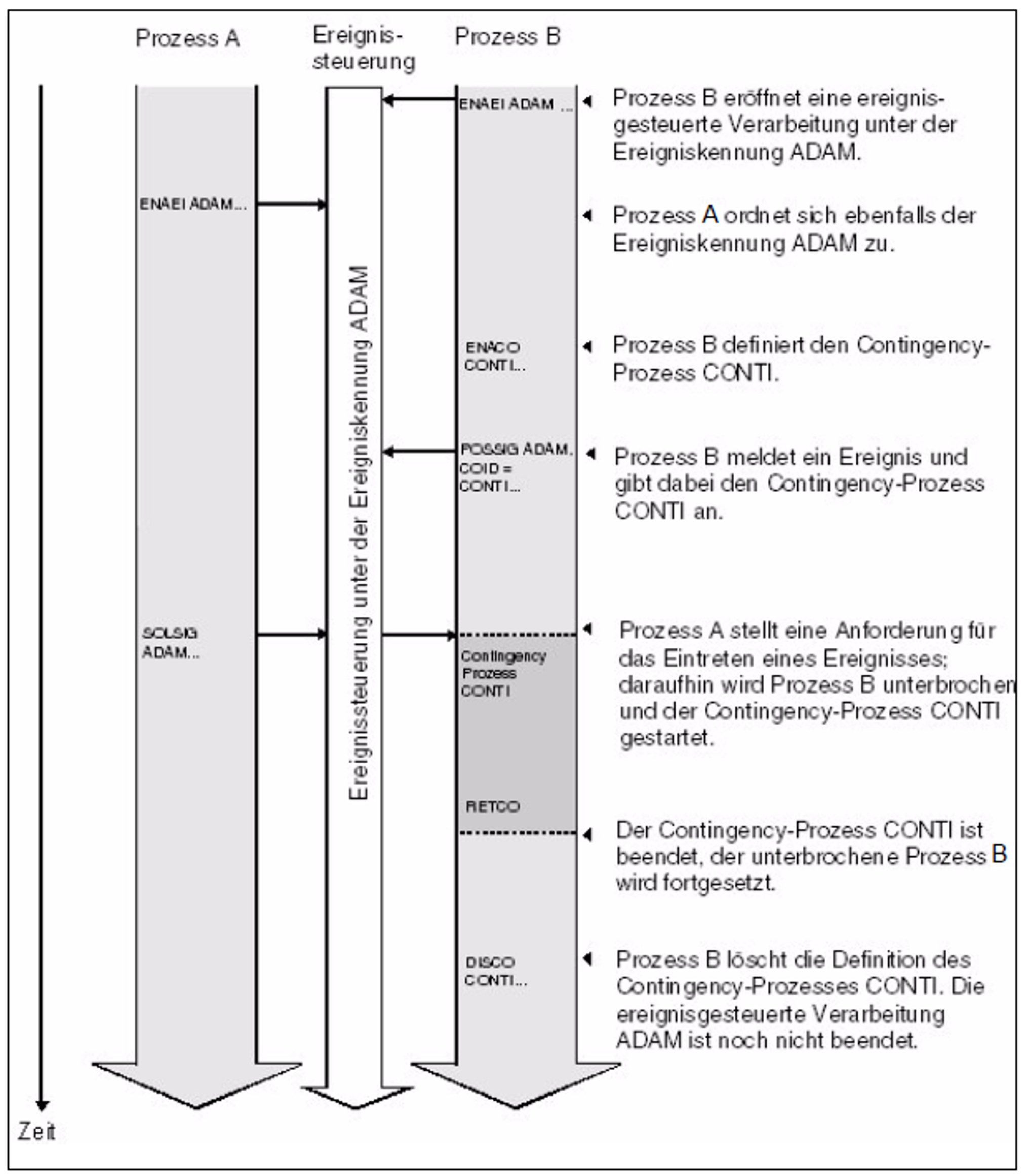 Der Contingency-Prozess wurde in dem Makroaufruf SOLSIG zur Anforderung eines Ereignissignals angegeben, und das Signal ist eingetroffen (Bild 17 (Ereignisgesteuerte Verarbeitung (Eventing))) bzw. die Wartezeit ist verstrichen.
