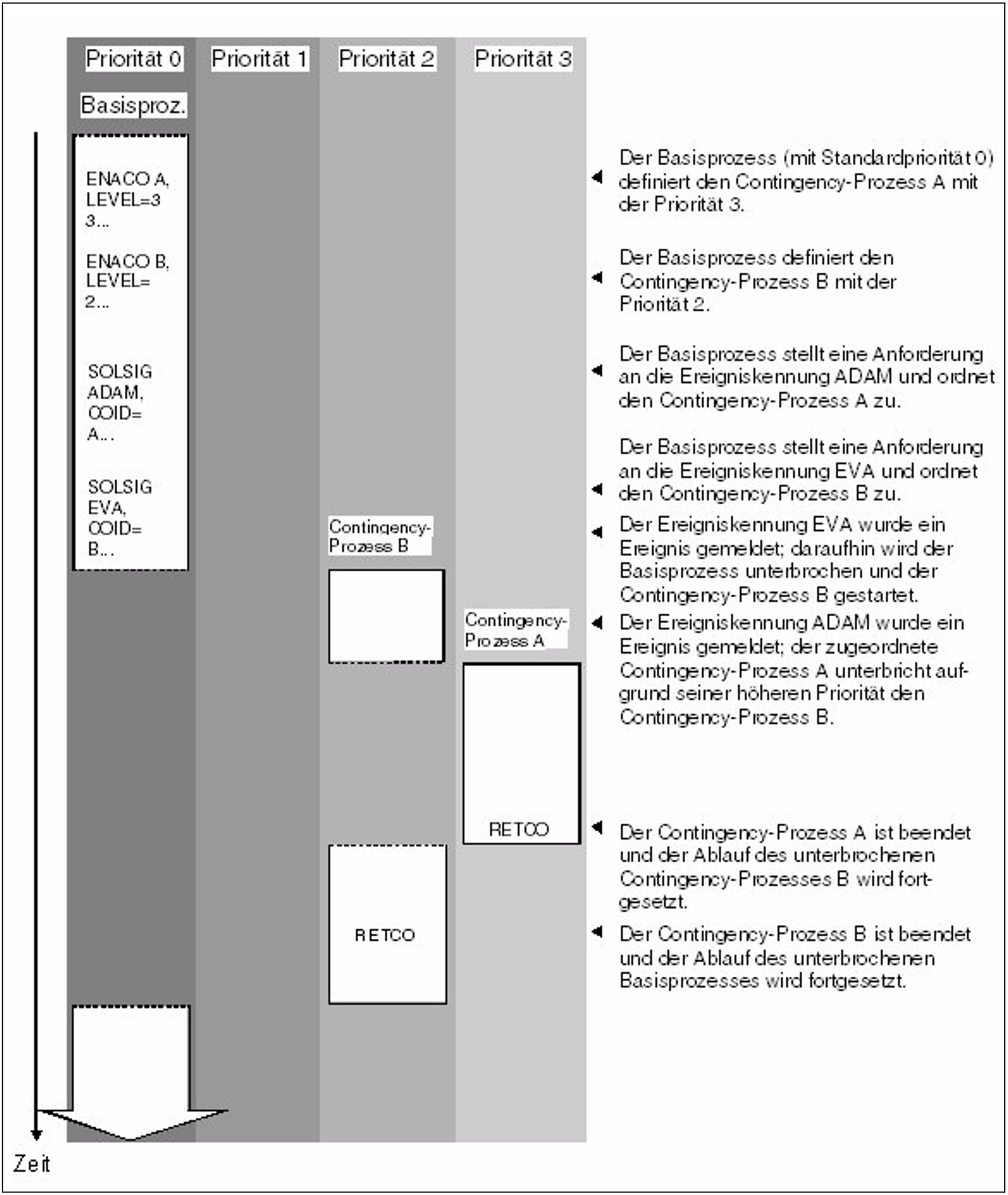 Ein Prozess darf seine Priorität nicht derartig herabsetzen, dass sie unter der eines Prozesses liegt, der bereits gestartet (und unterbrochen) war. Dieser zu irgendeinem früheren Zeitpunkt gestartete und unterbrochene Prozess darf erst nach Beendigung des nach ihm gestarteten Contingency-Prozesses wieder zum Ablauf kommen.