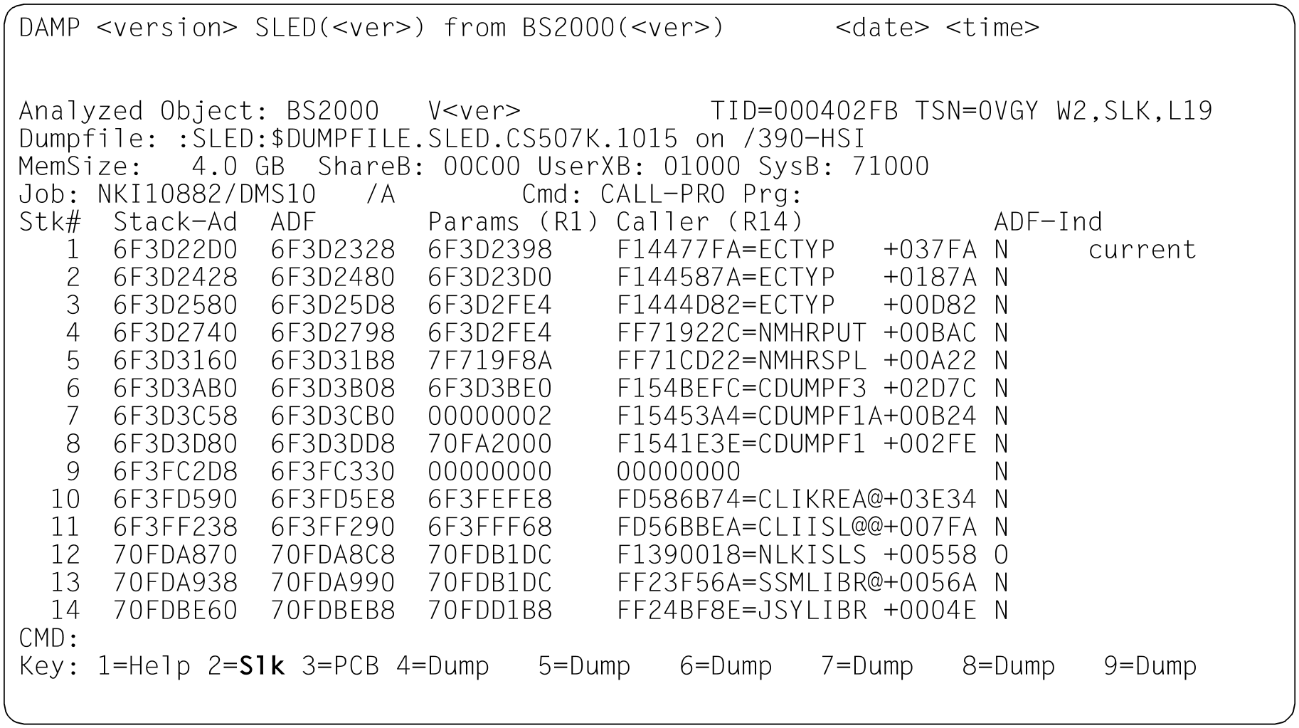 | SLK | In diesem Modus wird die Kette der Aufrufe über den TPR-Program-Manager (SPL-Linkage) ausgegeben. Das Modus-Feld in der Kopfzeile des Fensters muss dazu mit dem Symbol Bild 20: Kette der Program Manager Aufrufe im Status-Fenster (W2) Aus dem ersten Stack erfolgt die Rückkehr zur Taskübersicht mit / „-“ oder durch Eingabe von |