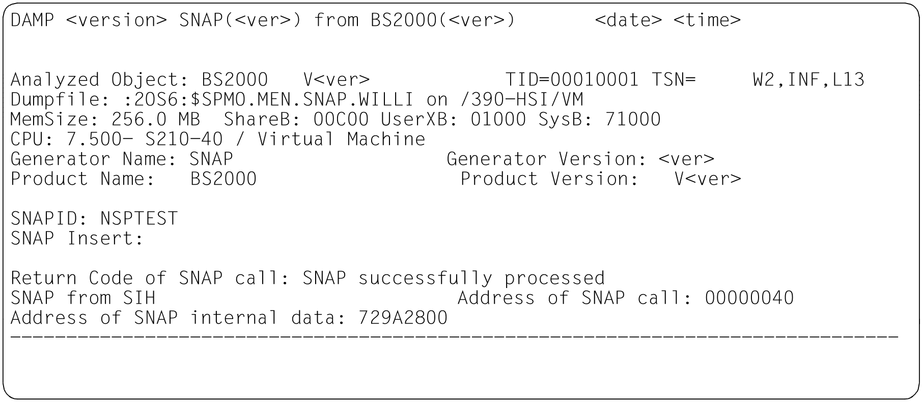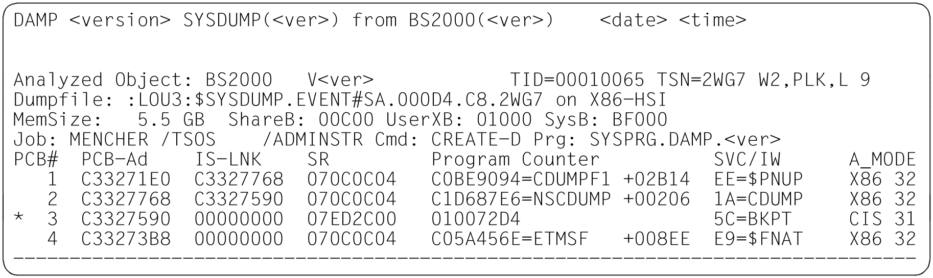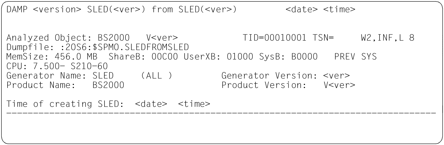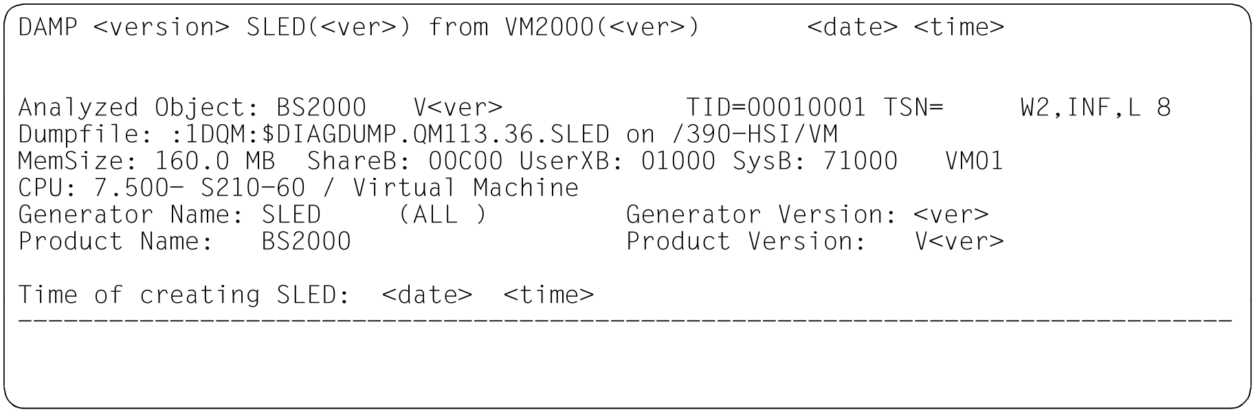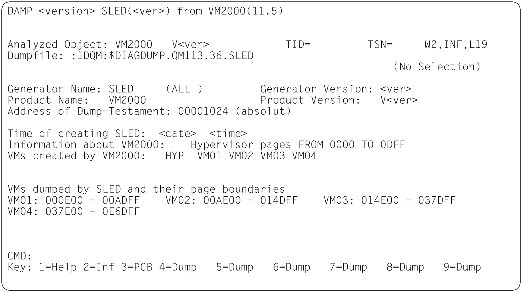 | INF | Beispielfenster zu den verschiedenen Dumpdateitypen im Modus INF Bild 11: Informationsbildschirm im Status-Fenster (W2). Dumperzeuger CDUMP. Dumpobjekt BS2000 (SU x86 nach Live Migration) Bild 12: Informationsbildschirm im Status-Fenster (W2). Dumperzeuger SLED. Dumpobjekt BS2000 (SU /390 nach abnormaler Systembeendigung) Bild 13: Informationsbildschirm im Status-Fenster (W2). Dumperzeuger SNAP. Dumpobjekt BS2000 (S-Server) Bild 14: Informationsbildschirm im Status-Fenster (W2). Dumperzeuger SLED. Dumpobjekt VM2000 Bild 15: Informationsbildschirm im Status-Fenster (W2). Dumperzeuger SLED. Dumpobjekt SLED Bild 16: Informationsbildschirm im Status-Fenster (W2). Dumperzeuger SLED. Dumpobjekt BS2000 in der Monitor-VM |