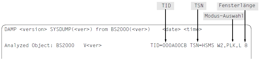 Durch Markieren (siehe Abschnitt „Markieren" (Diagnosefenster verändern)) der Adresse des Dump-Testaments kann der Speicherinhalt des Dump-Testaments in einem Standardfenster mit Adressierungsmodus RM bzw. ABS ausgegeben werden. Abhängig vom Dumpdateityp kommen dazu die folgenden Informationen: