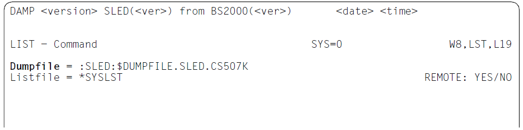 Die gewünschte Datei wird durch Eintragen eines voll- oder teilqualifizierten Dateinamens in das Feld „Dumpfile“ der List-Maske ausgewählt. Dabei ist innerhalb des Dateinamens die Benutzung von Wildcards erlaubt. Zusätzlich wird der String „$TSN“ innerhalb des Dateinamens durch die TSN der Aufrufer-Task ersetzt. Letzteres erleichtert besonders das Auffinden aktuell erzeugter Benutzer-Dumps.
