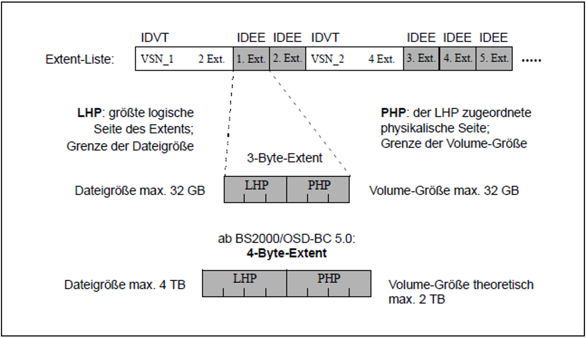 Aus Kompatibiltätsgründen unterstützt BS2000 beide Formate der Extent-Liste wie folgt: