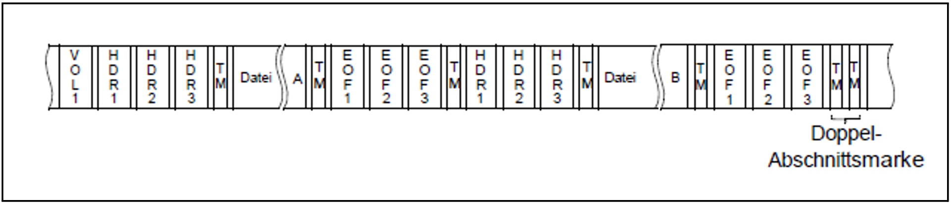 Da noch weitere Dateien auf dem Band folgen, schließt sich an die EOF-Kennsätze nur eine einfache Abschnittsmarke vor den HDR-Kennsätzen der zweiten Datei an, usw. Erst nach den EOF-Kennsätzen der letzten Datei steht die Doppel-Abschnittsmarke. In den HDR1- und EOF1-Kennsätzen wird in der „Dateifolgenummer“ (= File Sequence Number, FSEQ) die Position der Datei in der Dateimenge verankert.