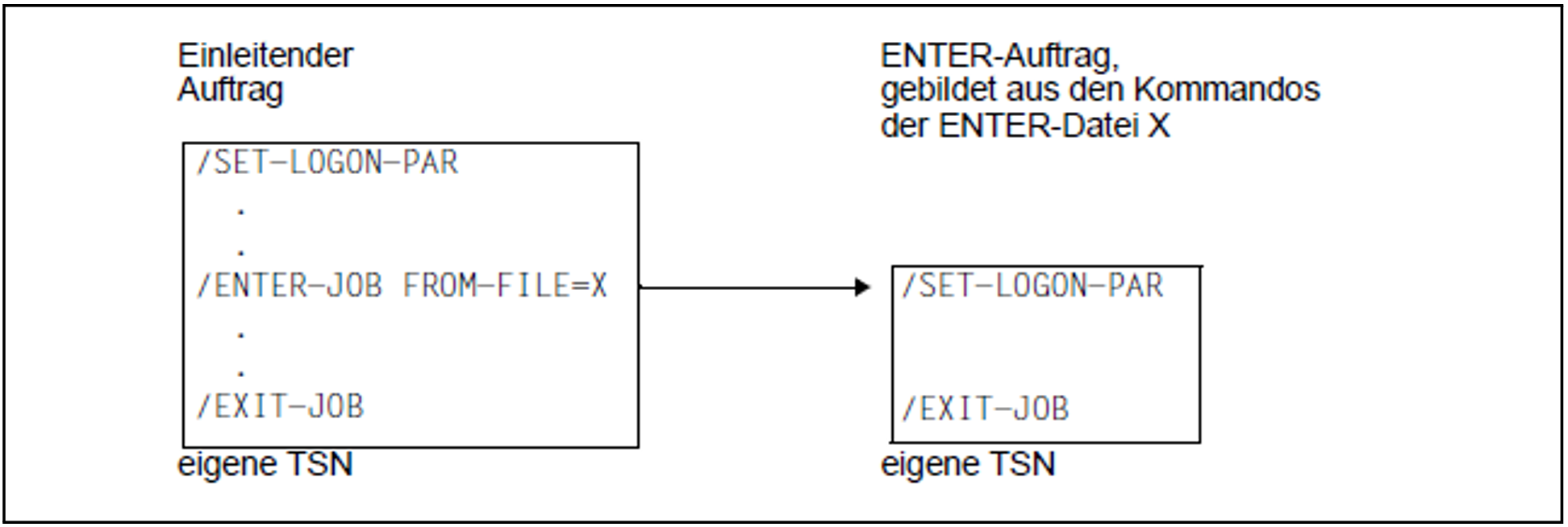 Mit dem Kommando ENTER-JOB lässt sich von einem Dialog- oder Batchauftrag aus ein weiterer Batchauftrag (ENTER-Job) einleiten. Dieser neue Batchauftrag ist vom erteilenden Auftrag unabhängig und wird vom System mit einer eigenen Auftragsnummer (TSN, task sequence number) versehen. Der Batchauftrag wird auch ENTER-Auftrag genannt (siehe Bild 4 "ENTER-JOB startet ENTER-Auftrag"). Die ehemalige Bezeichnung ENTER-Prozedur gilt dagegen als veraltet, weil sie zu sehr an das Kommando ENTER-PROCEDURE erinnert. Dieses Kommando erwartet jedoch ein anderes Dateiformat.