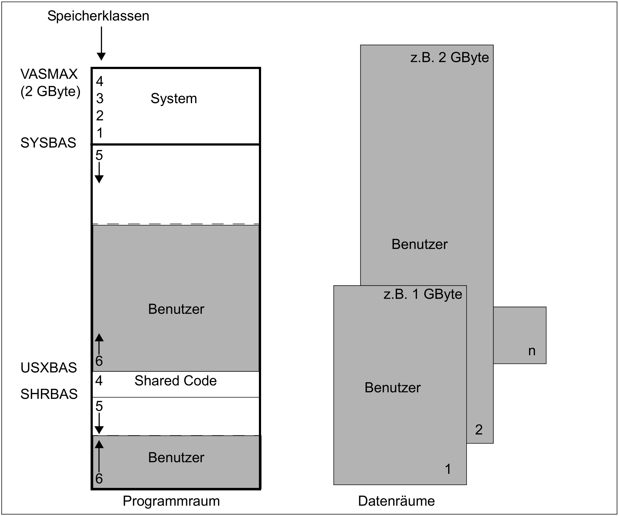 Ein Datenraum ist ein Bereich von zusammenhängendem virtuellen Adressraum in der Größe von 4 KByte bis 2 GByte.