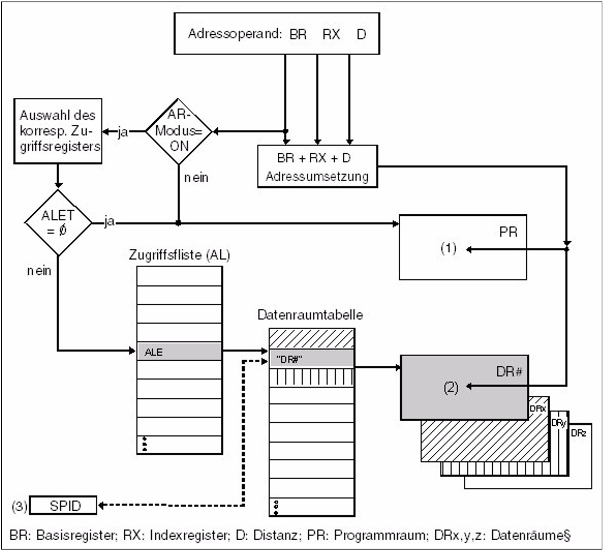 Wird jedoch bei der Adressberechnung (auch) ein Basisregister zur Adressierung verwendet und ist der ALET des mit ihm korrespondierenden Zugriffsregisters nicht Null, wird der entsprechende Datenraum adressiert. Somit kann jeder Adresse, die über ein Basisregister angesprochen wird, ein eigener Datenraum zugeordnet werden. Da MZR0 nicht als Basisregister verwendet werden darf, kann auch AR0 nicht zur Adressierung eines Datenraums verwendet werden.