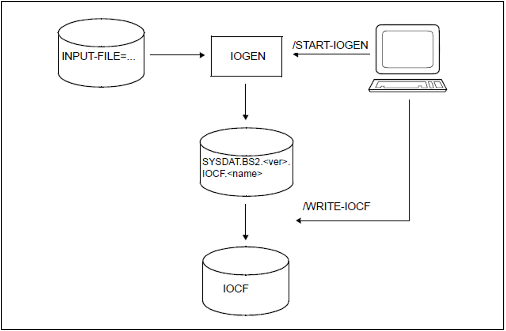 IOGEN erzeugt nach dem erfolgreichem IOGEN-Lauf direkt die IOCF-Datei SYSDAT.BS2.<ver>.IOCF[.<name>] mit den Konfigurationsdaten der Kanalperipherie. Dabei ist <name> der Name, der in der GEN-Anweisung angegeben werden kann.