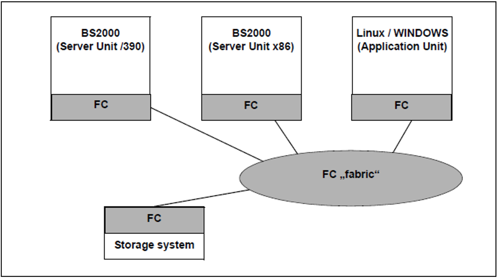 BS2000 unterstützt für die mit dem Fibre Channel Protocol angeschlossenen Speichersysteme Verbindungen vom Typ „fabric“. Dabei werden dedizierte Verbindungen zwischen Server Units und Speichersystemen geschaltet. Eine Server Unit sieht nur die ihr zugeordneten Speichersysteme. Die Server Units und Speichersysteme bilden Domänen, die einander über Switches zugeordnet werden (sog. „zoning“).