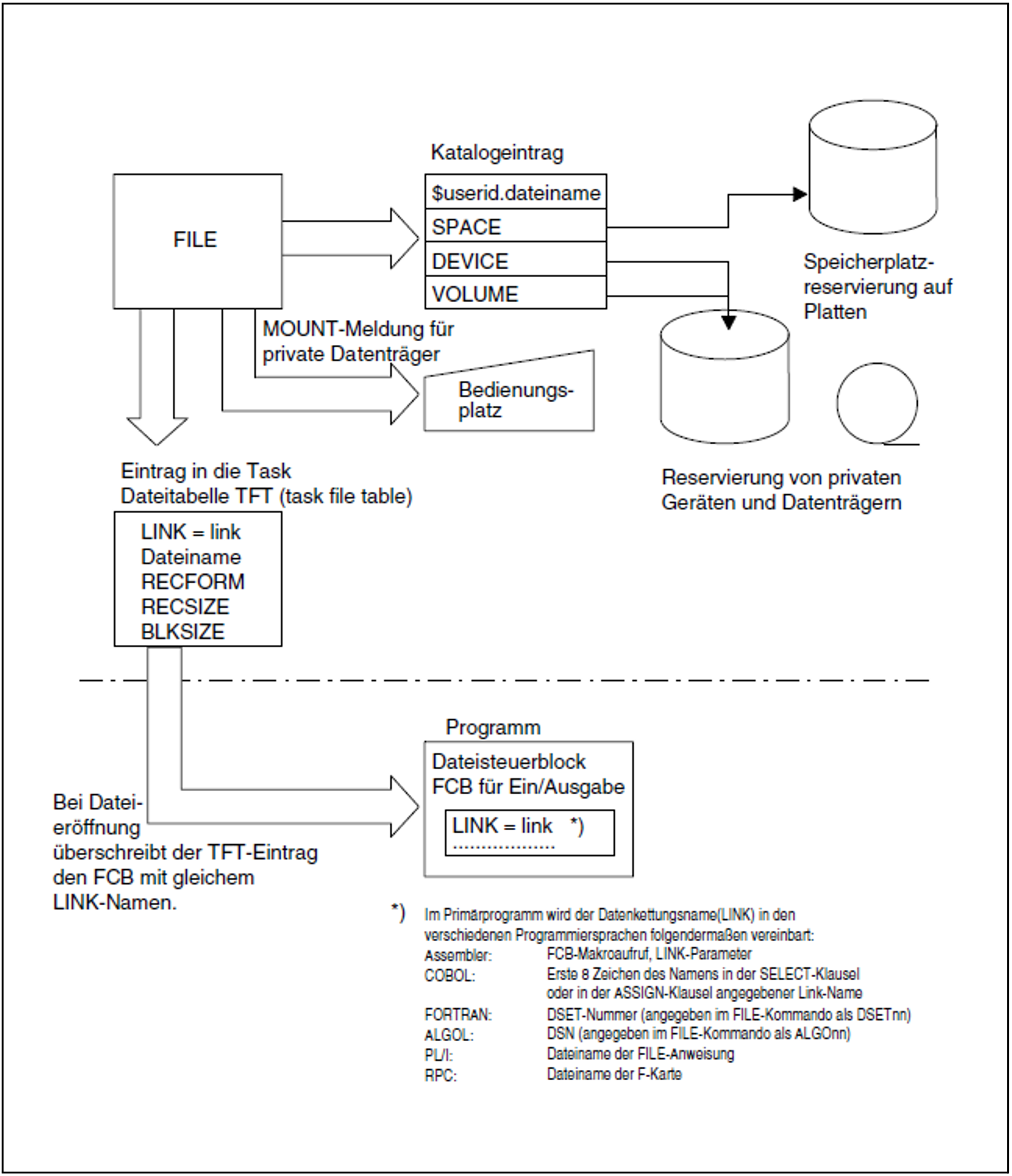 Über die Task File Table (TFT) stellt der FILE-Makroaufruf eine Verbindung her zwischen Programm und Datei, zwischen den im FILE-Makroaufruf bzw. im Katalogeintrag definierten Dateimerkmalen und dem FCB-Makroaufruf.