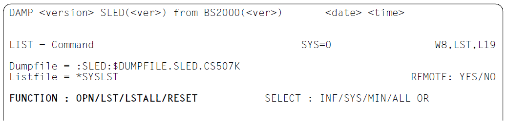 LSTALL | Alle in der Dateiliste enthaltenen Dumpdateien (mit BS2000-Objekt) werden ausgedruckt. Dabei werden für alle Dateien die in der List-Maske hellgesteuerten und die markierten Parameter wirksam. |
