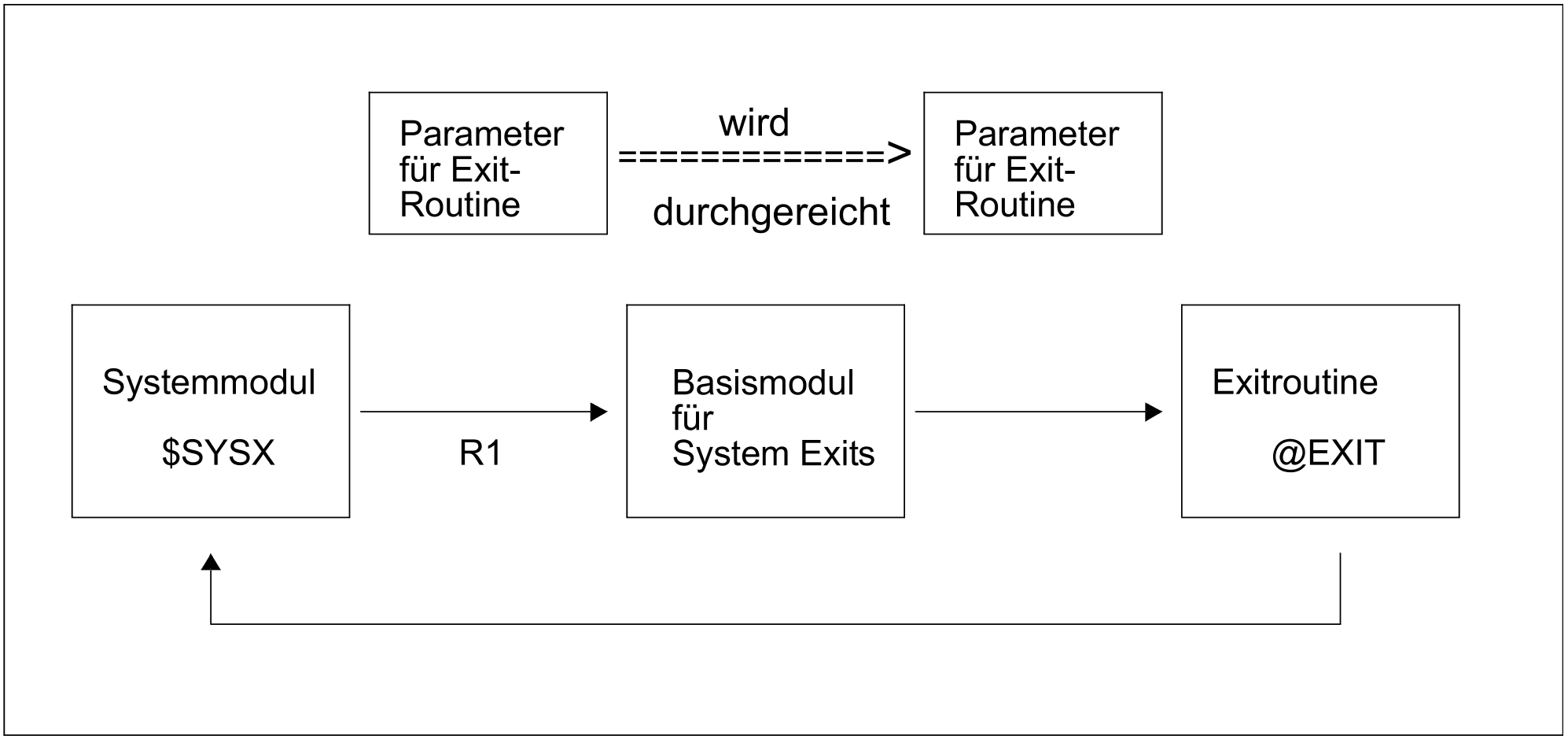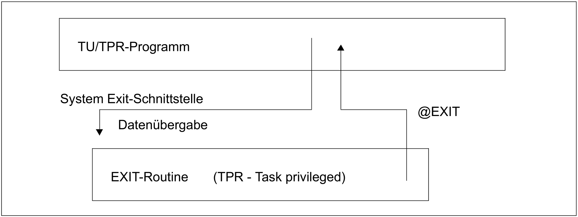 Ein System-Modul, bei dem ein Exit-Punkt vorgesehen ist, verzweigt über eine TU- bzw. TPR-Makroschnittstelle in die dazugehörige Exit-Routine, falls diese existiert und aktiv ist. Dabei übergibt der Modul exitspezifische Parameter und Daten an die Exit-Routine. Diese kann, abhängig vom gewünschten Verwendungszweck, die Daten prüfen und evtl. modifizieren, eine Anforderung abweisen oder protokollieren. Anschließend erfolgt der Rücksprung in den rufenden System-Modul durch den Makro @EXIT in Programm-Manager-Umgebung (DSL-Environment) bzw. über BR R14 bei reinen Assembler-Routinen. Neue Exitroutinen sollten unbedingt in DSL-Environment entwickelt werden.