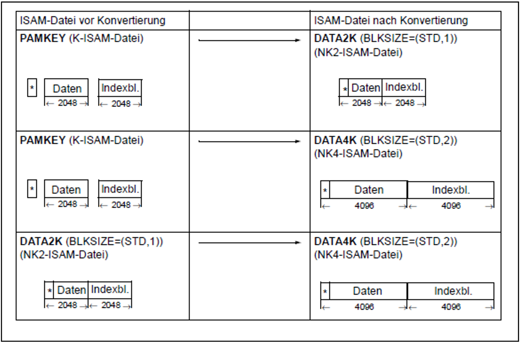 Die nachfolgende Tabelle fasst alle Konvertierungsmöglichkeiten für eine ISAM-Datei zusammen: