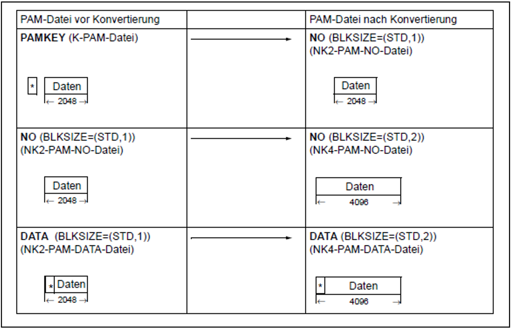 Mit PAMCONV kann der Blockungsfaktor einer Datei von ungeradzahlig in geradzahlig umgewandelt werden. Nur Dateien mit geradzahligem Blockungsfaktor können auf einer NK4-Platte abgespeichert werden.