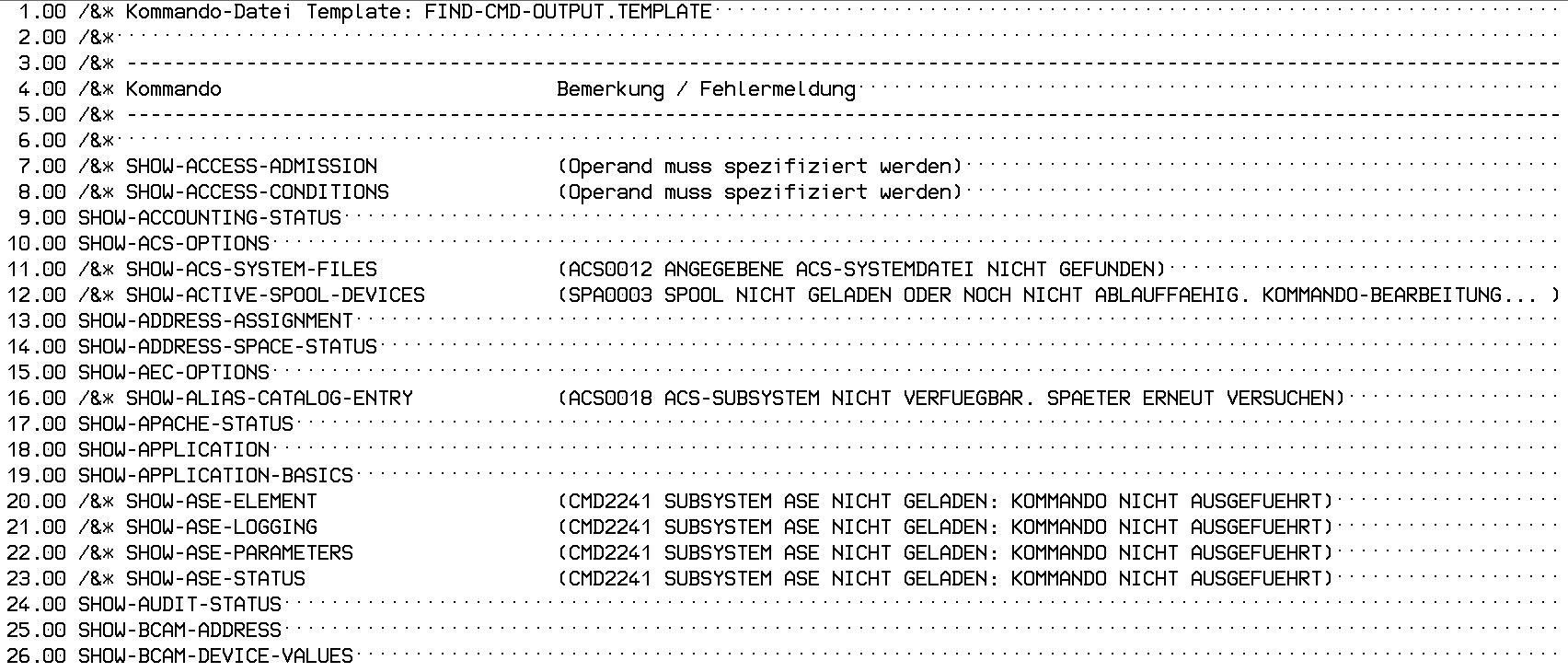 Mit dem Kommando GENERATE-FIND-CMD-TEMPLATE lässt sich ein Template einer Kommando-Datei für das Kommando FIND-CMD-OUTPUT erzeugen. Die so erzeugte Datei kann anschließend bedarfsgerecht angepasst und als Eingabedatei (Operand CMD=*FROM-FILE(...)) im Kommando FIND-CMD-OUTPUT verwendet werden.