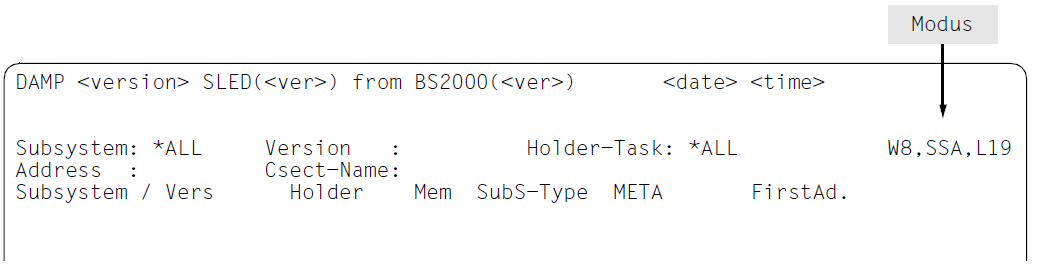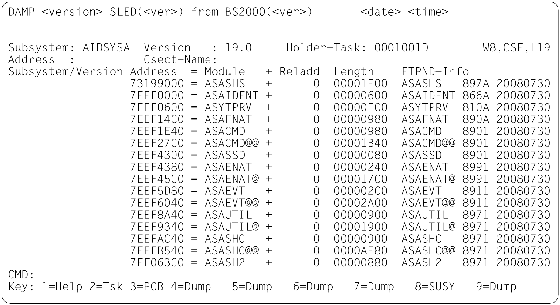enthält die ETPND-Information mit Modulname, Versionsnummer und Übersetzungsdatum.Die Länge des Moduls kann null sein, wenn es sich um einen Großmodul handelt. Die ETPND-Information kann in System-, User- oder Areadumps fehlen, wenn die zugehörige virtuelle Seite nicht im Diagnoseobjekt enthalten ist, weil der Dumperzeuger nur die referenzierten Coding-Seiten abspeichert.