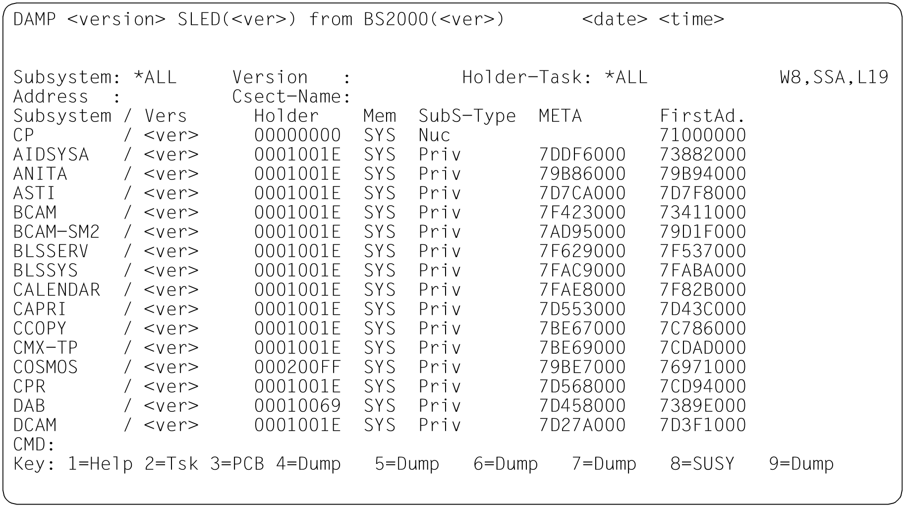 SSA Eine Liste aller Subsysteme wird ausgegeben. SSC Es werden die mit der aktuellen Task verbundenen Subsysteme angezeigt. SSH Eine Liste aller Subsysteme, deren Holder-Task mit der angegebenen TID übereinstimmt, wird ausgegeben (nur Ausgabefeld). CTX Für alle Subsysteme wird der Kontext-Name ausgegeben. INF CTX wird rückgängig gemacht.