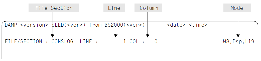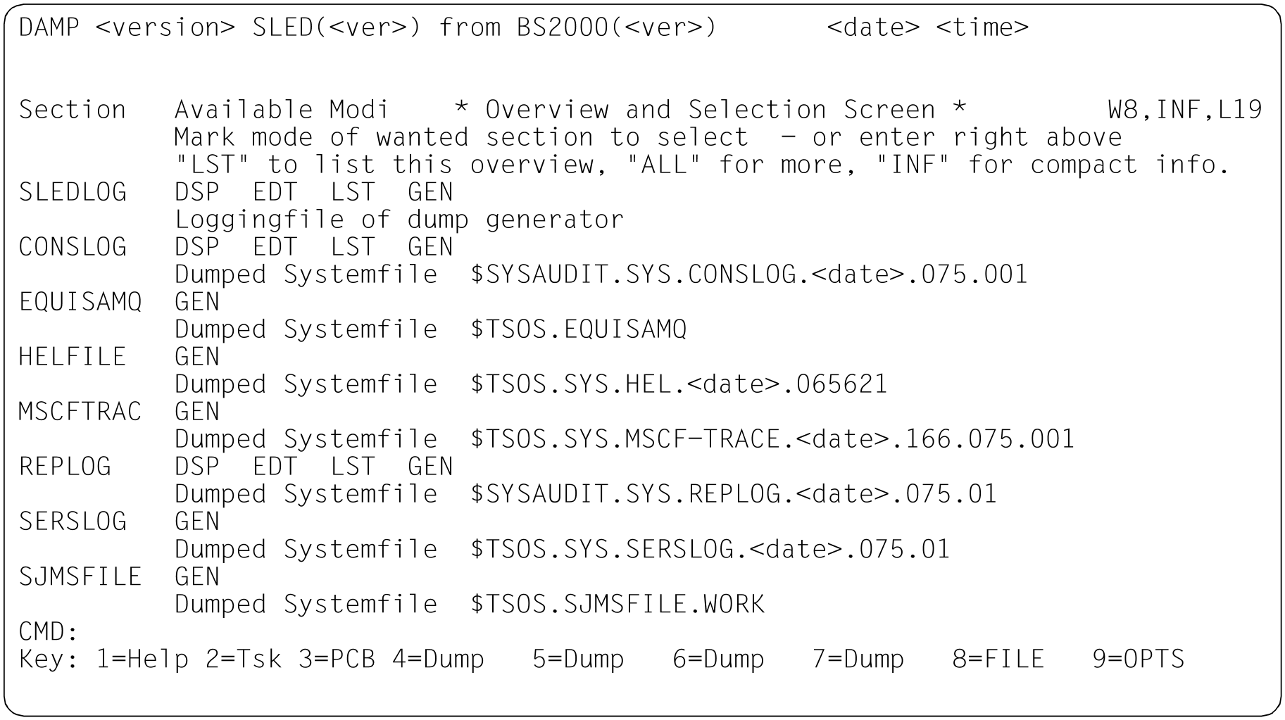 wird das gewünschte Dumpfenster W4 - W9 bzw. W21 - W99 als oberstes Fenster in der aktuellen Fensterlänge in Form eines Übersichts- und Auswahlschirms im Modus INF ausgegeben. In diesem Schirm sind alle in der Dumpdatei enthaltenen Sections aufgelistet. Es kann mit den üblichen Scroll-Kommandos geblättert werden.