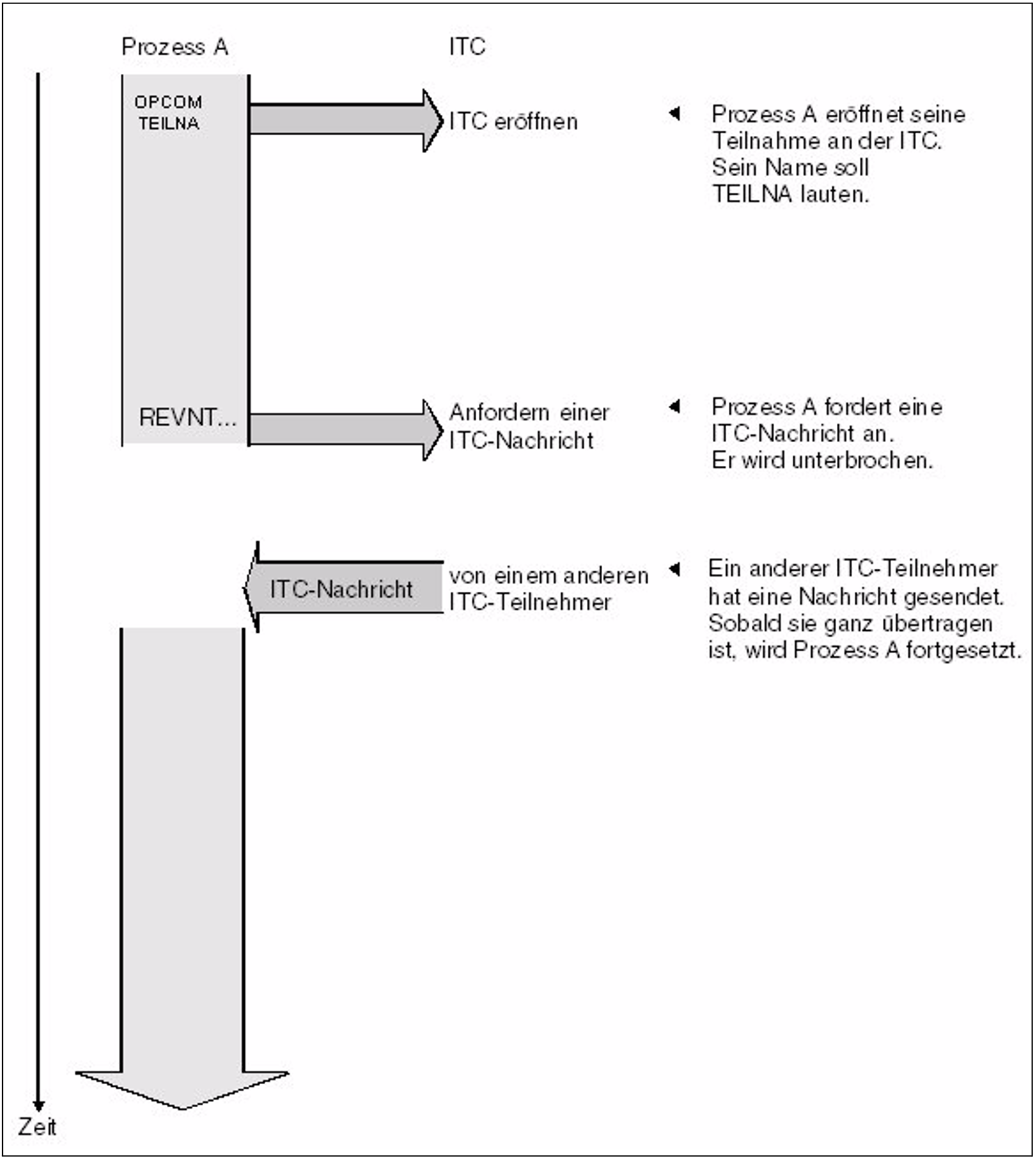 Soll ein Programm an der Intertaskkommunikation teilnehmen, so muss der Makro OPCOM aufgerufen und ein ITC-Name übergeben werden. Das System prüft diesen Namen und weist ihn ab, wenn er schon an einen anderen ITC-Teilnehmer vergeben ist. Ist der Name eindeutig und ist genügend Systemspeicher (für ITC-Listen) verfügbar, so nimmt das System die Task unter den ITC-Namen in die Teilnehmerliste auf. Ist die Task der erste Teilnehmer an der ITC, so wird mit dem Aufruf OPCOM zusätzlich die Eröffnung des ITC-Verfahrens ausgelöst (das System richtet eine Kommunikationstabelle ein). OPCOM wird abgewiesen, wenn für die Listen und Tabellen nicht genügend Systemspeicher zur Verfügung steht.