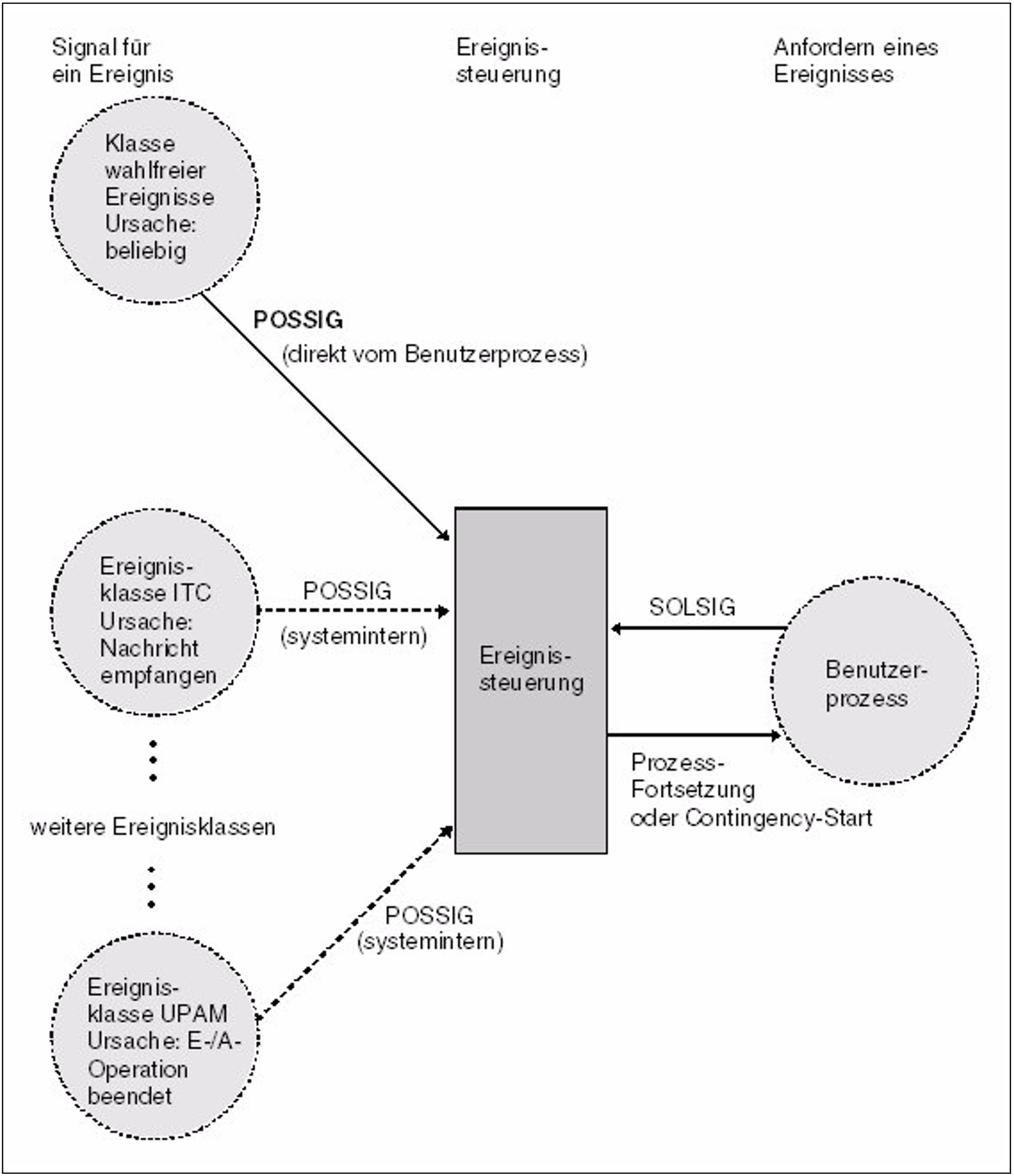Ein Programm, das von der Ereignissteuerung ein Signal anfordert (SOLSIG), kann auch dasjenige sein, in dem das erwartete Ereignis eintritt. Zum Beispiel wird mit einem PAM-Aufruf eine Ein-/Ausgabeoperation eingeleitet und dann ein Ereignis-Signal angefordert (SOLSIG). Die Ereignissteuerung unterbricht daraufhin (synchroner Fall) den Programmlauf und setzt ihn fort, sobald ihr ein systeminterner POSSIG anzeigt, dass die Ein-/Ausgabeoperation abgeschlossen ist.
