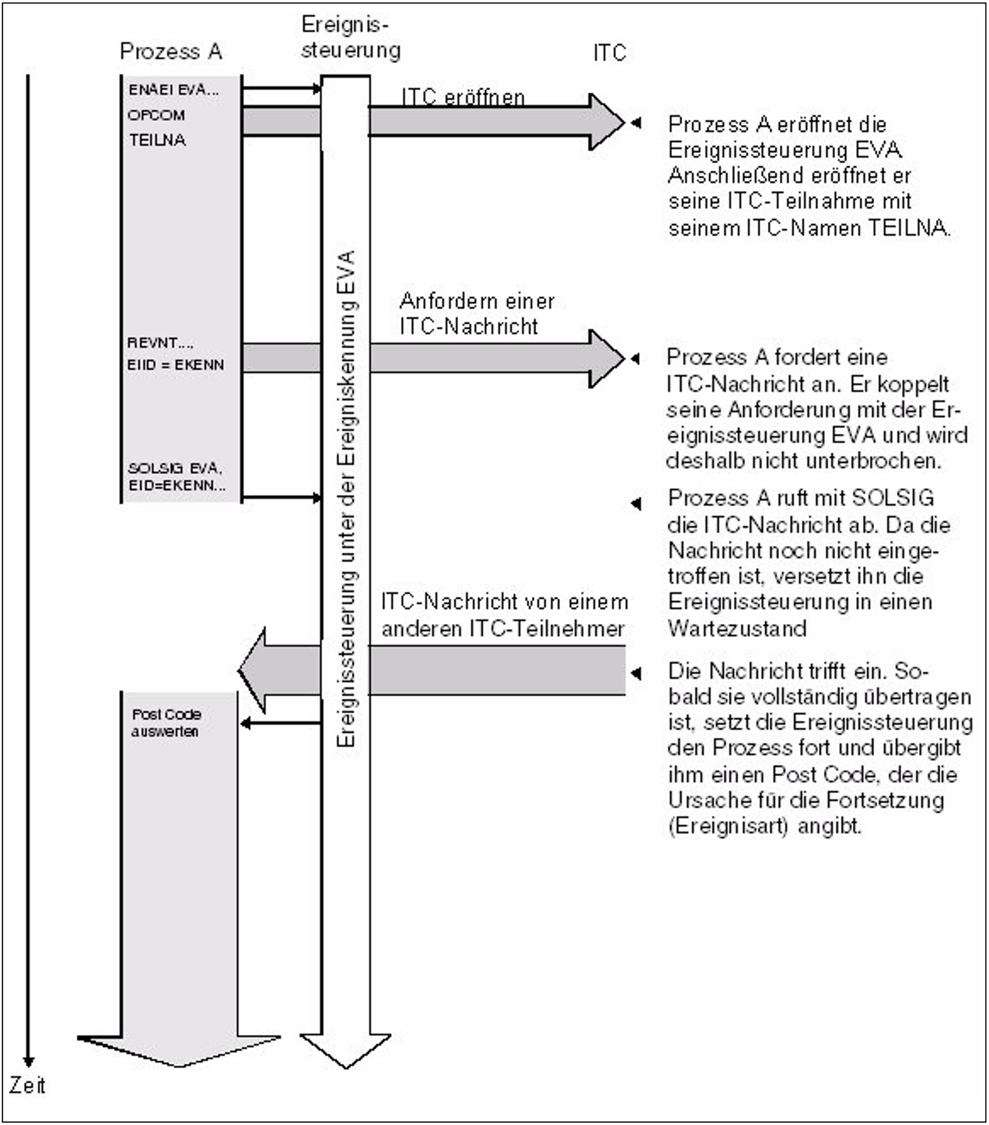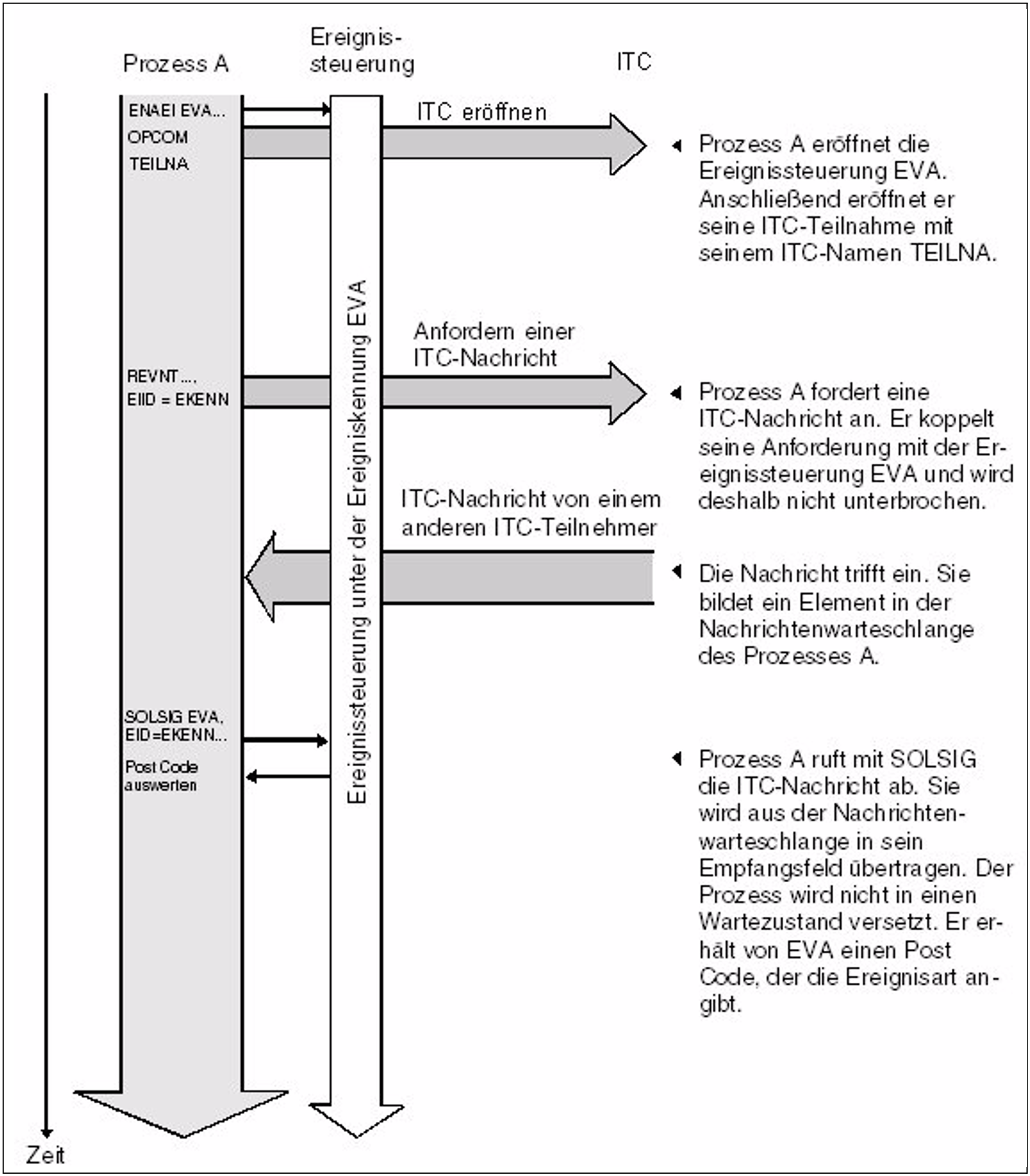 Die Anforderung einer Nachricht (Makro REVNT) kann mit der Ereignissteuerung gekoppelt werden. Das Eintreffen der Nachricht stellt für die Ereignissteuerung ein ITC-Ereignis dar (siehe folgenden Abschnitt).