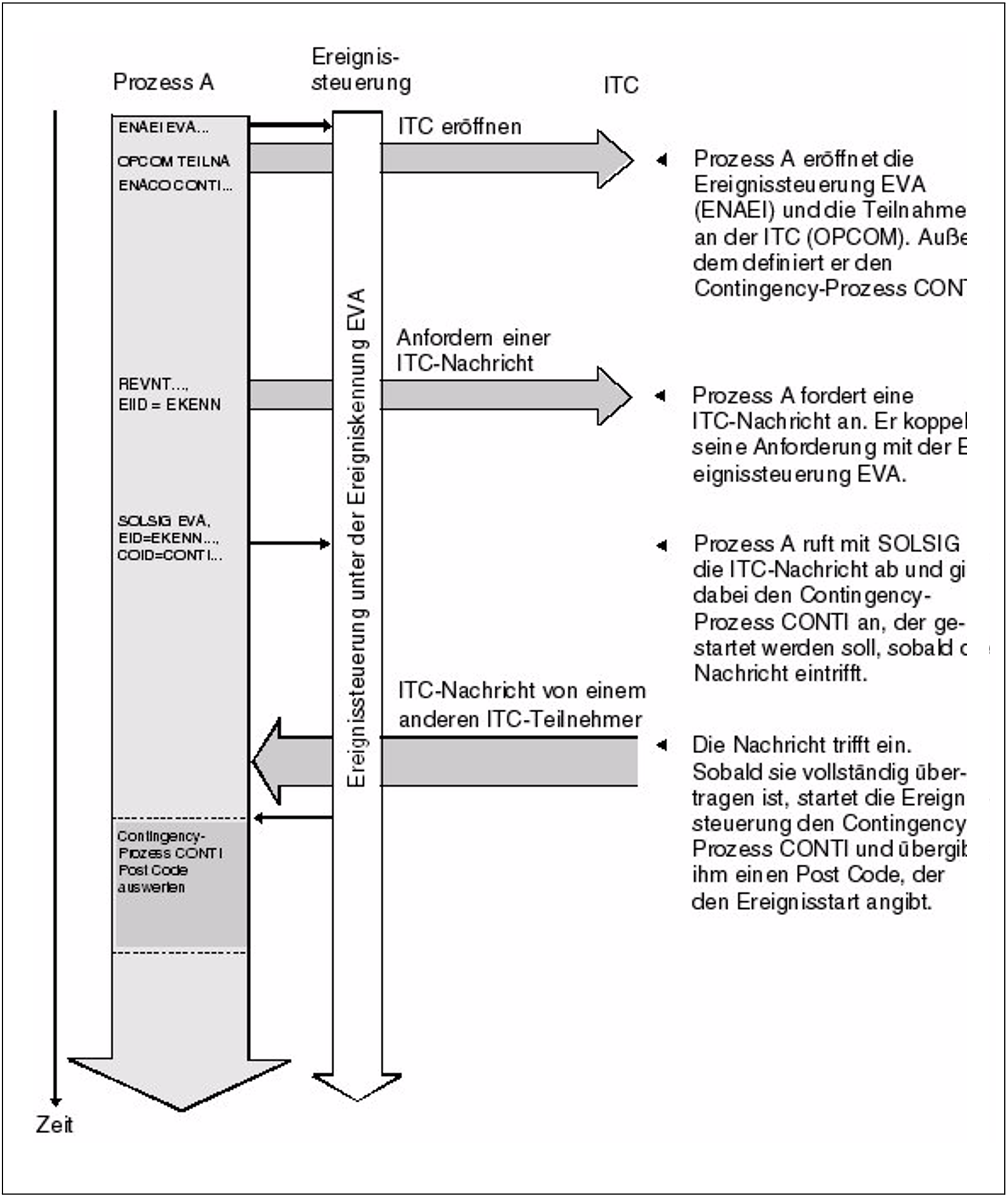 Die Verbindung von ITC und Ereignissteuerung bedeutet, dass ein (ITC-)Ereignis auftritt, wenn eine ITC-Nachricht eintrifft oder wenn die Wartezeit abgelaufen ist. Die Koppelung entsteht dadurch, dass im Aufruf REVNT die Kurzkennungsadresse einer Ereigniskennung angegeben wird. Der Programmablauf wird dann durch den REVNT-Aufruf nicht unterbrochen. Der Sender der Nachricht braucht der Ereignissteuerung nicht anzugehören.