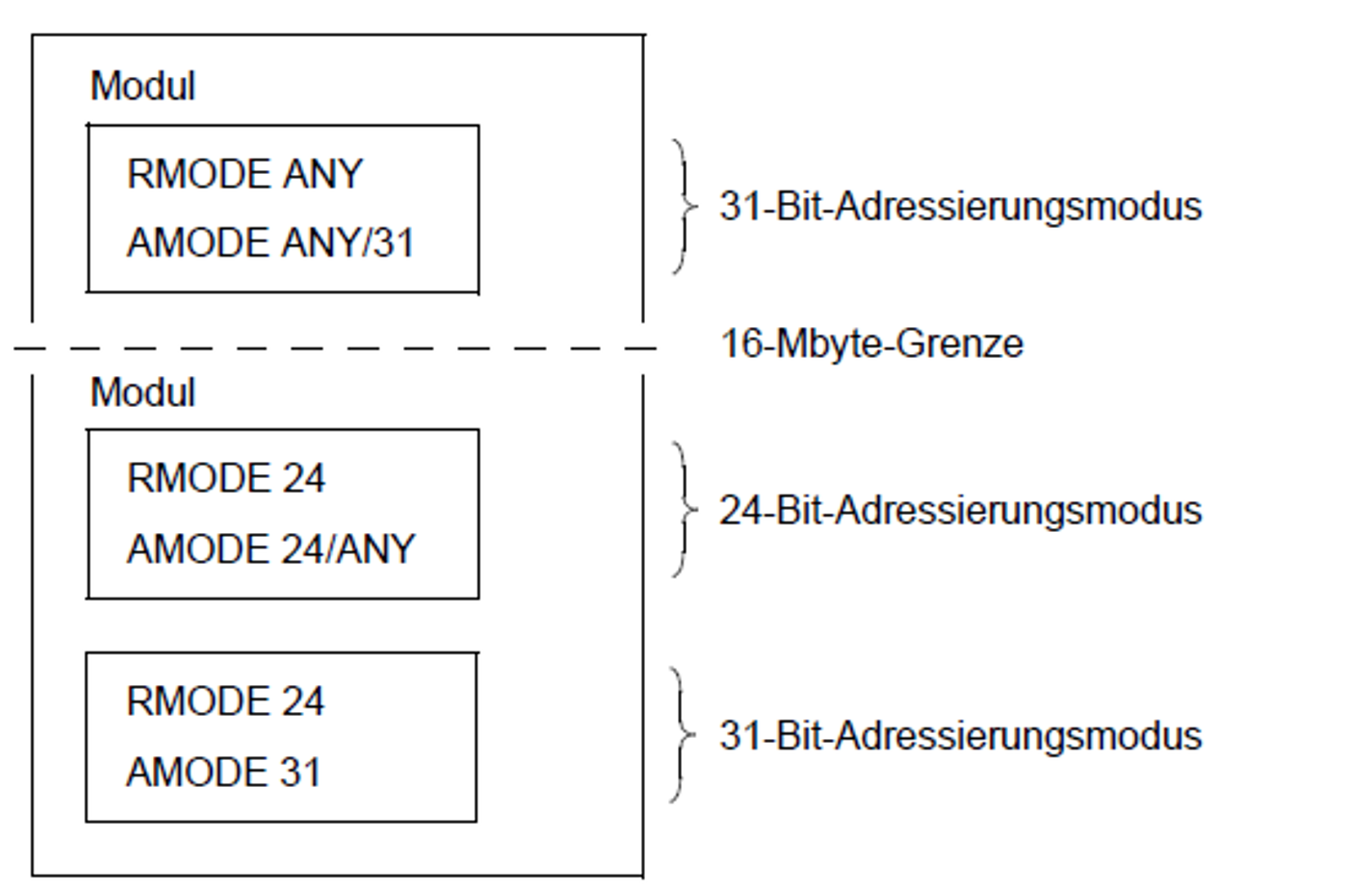 Der Adressierungsmodus wird bei AMODE ANY durch die Lage der Einsprungstelle bestimmt. Liegt die Einsprungstelle unterhalb 16 Mbyte, wird der 24-Bit-Adressierungsmodus eingestellt, bei Lage oberhalb 16 Mbyte der 31-Bit-Adressierungsmodus.