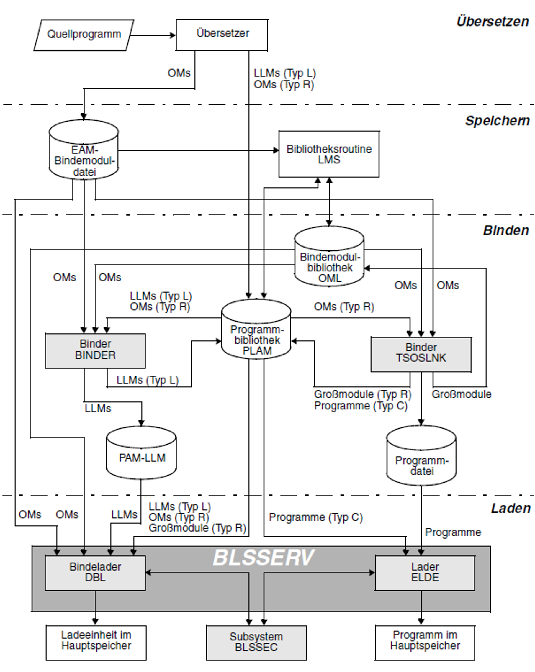 Die Binder BINDER und TSOSLNK sind Dienstprogramme. Der dynamische Bindelader DBL und der statische Lader ELDE dagegen gehören zum Subsysstem BLSSERV, das ein Teil des BS2000-Organisationsprogrammes ist. Sie bieten ihre Funktionalität über BS2000-Kommandos und über Programmschnittstellen an. Den Anstoß zur Ausführung eines geladenen Programmes gibt ein Starter, der Teil des Subsysstems BLSSERV ist und für den Benutzer unsichtbar bleibt.