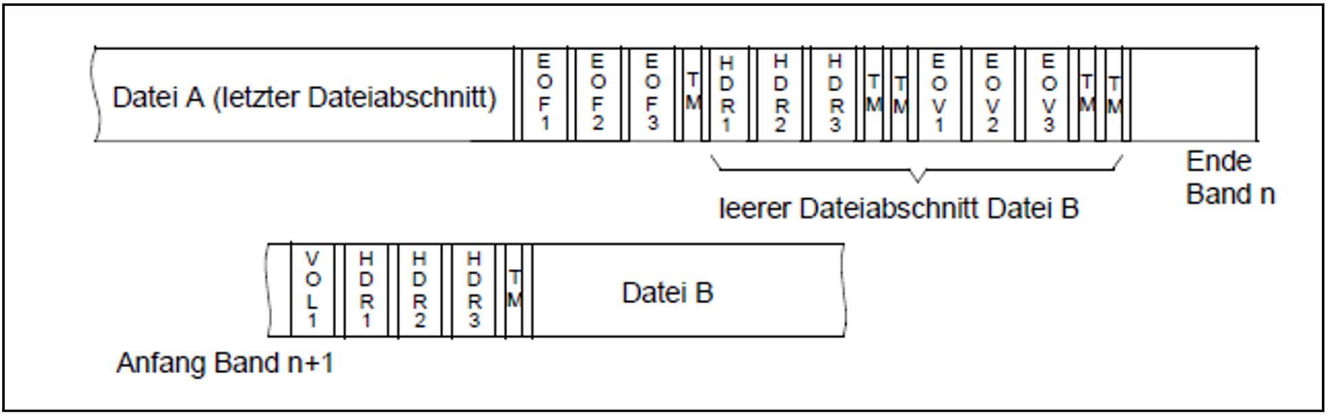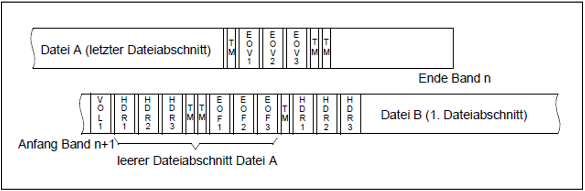 Erkennt das System das Bandende, während es den letzten Datenblock einer Datei oder die Dateiende-Kennsätze schreibt, schließt es das Band mit Bandende-Kennsätzen und Doppel-Abschnittsmarke ab. Nach dem Bandwechsel schreibt es auf das Folgeband nach dem Bandanfangs-Kennsatz zunächst die Dateianfangs-Kennsätze der nicht abgeschlossenen Datei und anschließend nach einer Doppel-Abschnittsmarke die Dateiende-Kennsätze.