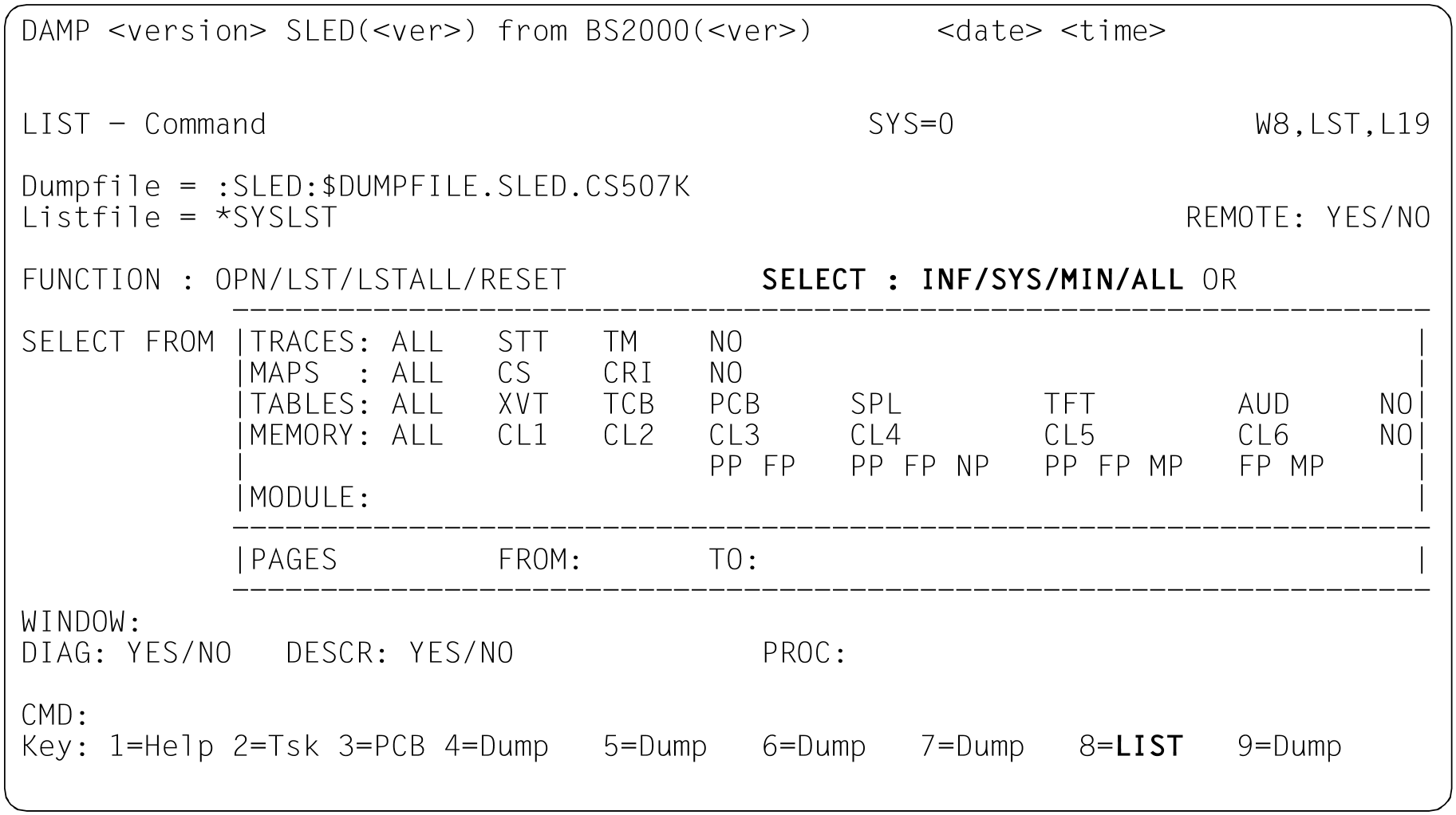 Der Umfang der Liste wird durch das Markieren der SELECT-Felder festgelegt. Dabei können Sie zwischen vier globalen Ausgabeformen (INF/SYS/MIN/ALL) und einer gezielten Ausgabe anzugebender Bereiche (SELECT FROM) wählen. Im ersten Fall entscheidet DAMP, im zweiten Fall Sie über die Auswahl der auszugebenden Bereiche. Um diese Unterscheidung augenfällig zu machen, befinden sich die nur in Verbindung mit SELECT FROM erlaubten detaillierten Auswahl-Parameter im inneren Rahmen der LIST-Maske. Jede Eingabe oder jedes Markieren in diesem Bereich führt automatisch zur Umschaltung auf SELECT FROM.