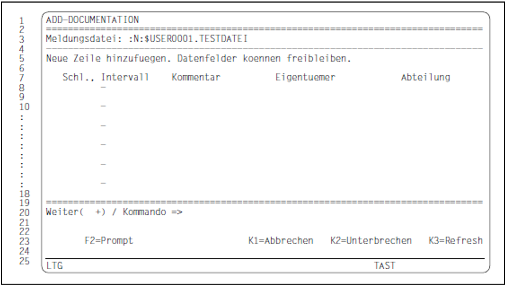 Im Unterschied zu MODIFY-DOCUMENTATION müssen in dieser Maske die Dokumentationszeilen an bereits vorhandene Dokumentation angefügt werden. Letztere ist vor Überschreiben geschützt.