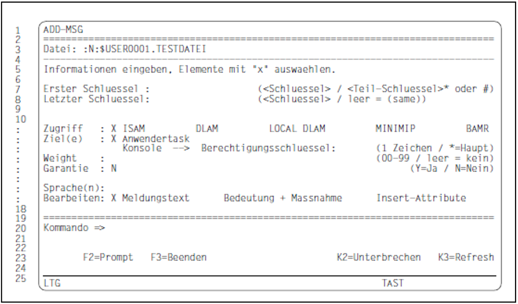 DUE | Die Funktion ADD-MSG wird gestartet; MSGMAKER verzweigt zu der Maske MSG-TEXT. |
