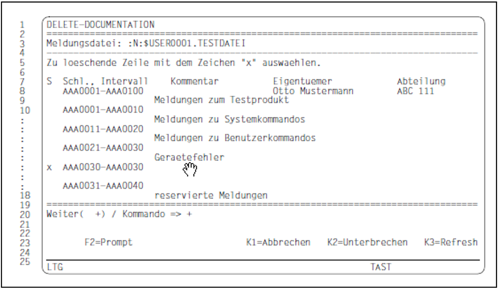 In dieser Maske können Dokumentationszeilen, die für eine oder mehrere Meldungseinheiten verfasst wurden, gelöscht werden. Im Unterschied zur Maske MODIFY-DOCUMENTATION können nur die Zeilen gelöscht werden, welche mit einem „x“ in der Spalte S markiert werden. Die Dokumentationszeilen selbst sind gegen Überschreiben geschützt.