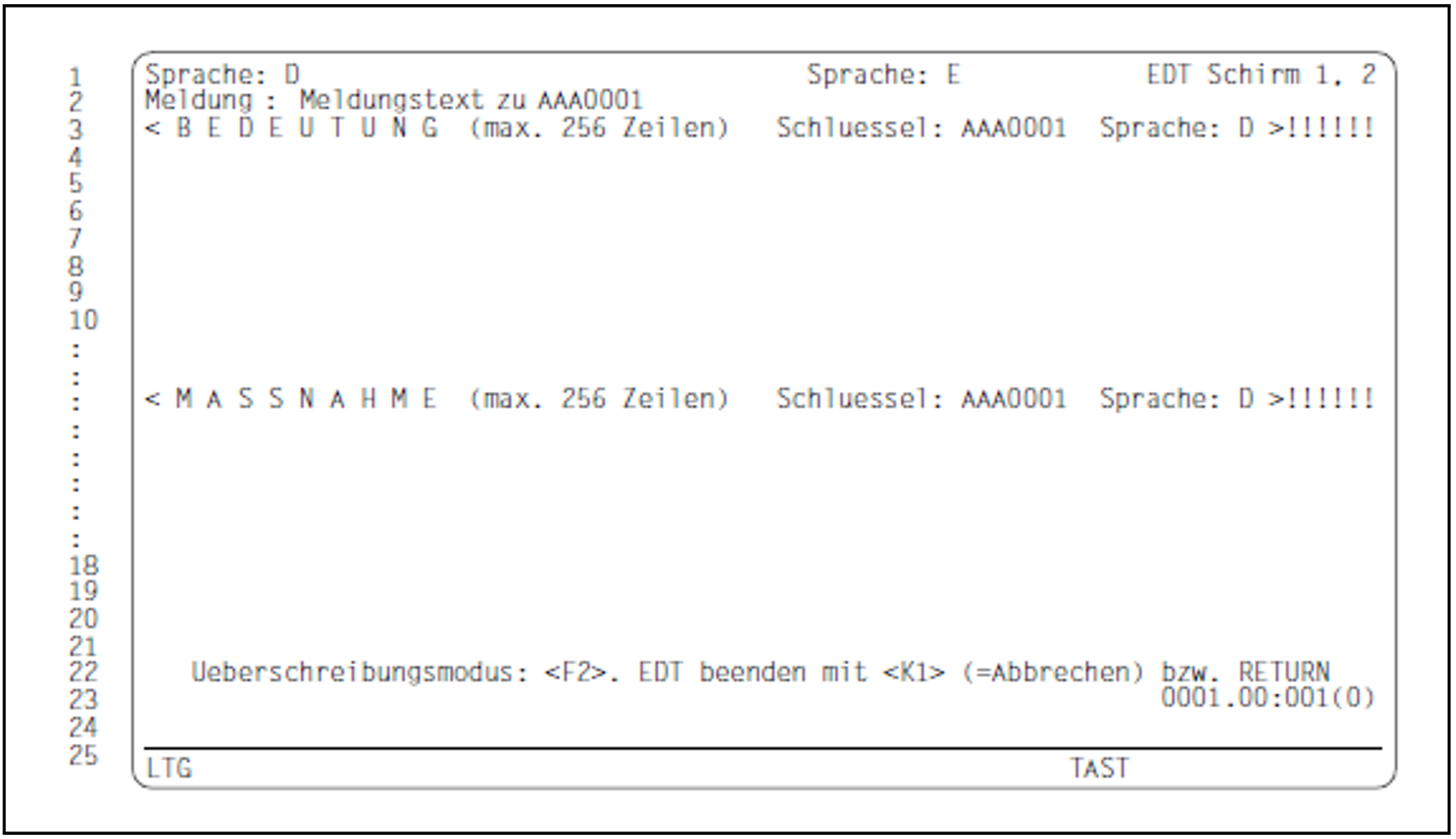 Der Bildschirm ist in zwei Bereiche unterteilt; in den oberen Bereich wird der Bedeutungstext, in den unteren der Maßnahmetext eingetragen. Enthält der Bedeutungstext mehr als neun Zeilen, muss der obere Bereich durch Einfügen neuer Zeilen erweitert werden, da jeder Text im unteren Bereich automatisch als Maßnahmetext interpretiert wird.