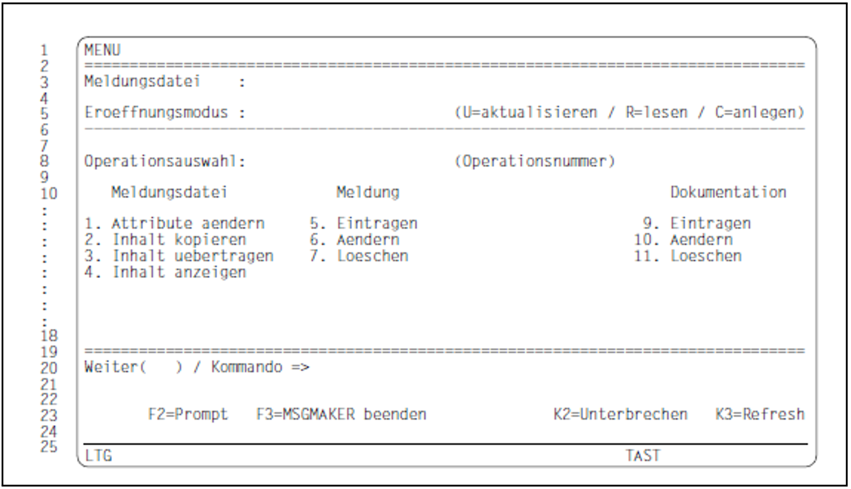 Die Operationen 1, 5, 6, 7, 9, 10 und 11 benötigen die Angabe einer Meldungsdatei, für 2, 3 und 4 muss in die Maske MENU keine Meldungsdatei eingetragen werden.